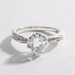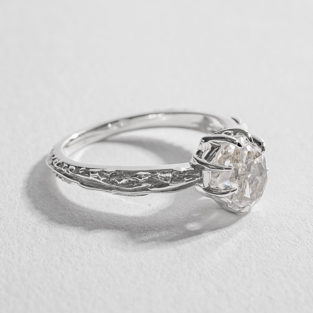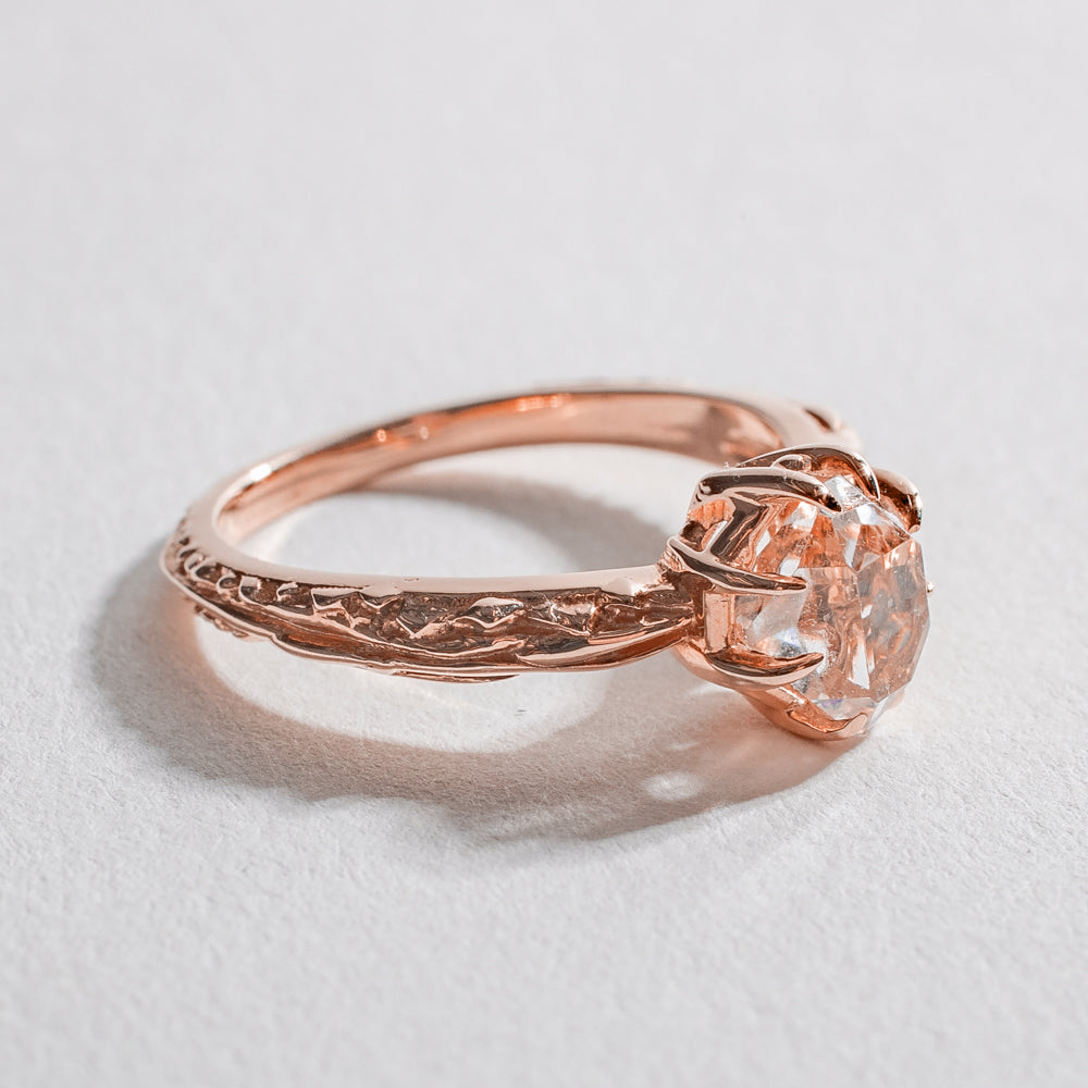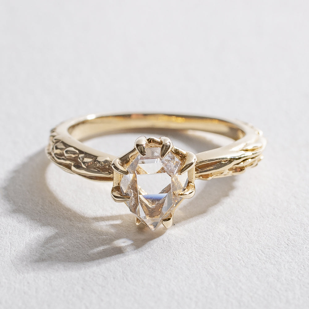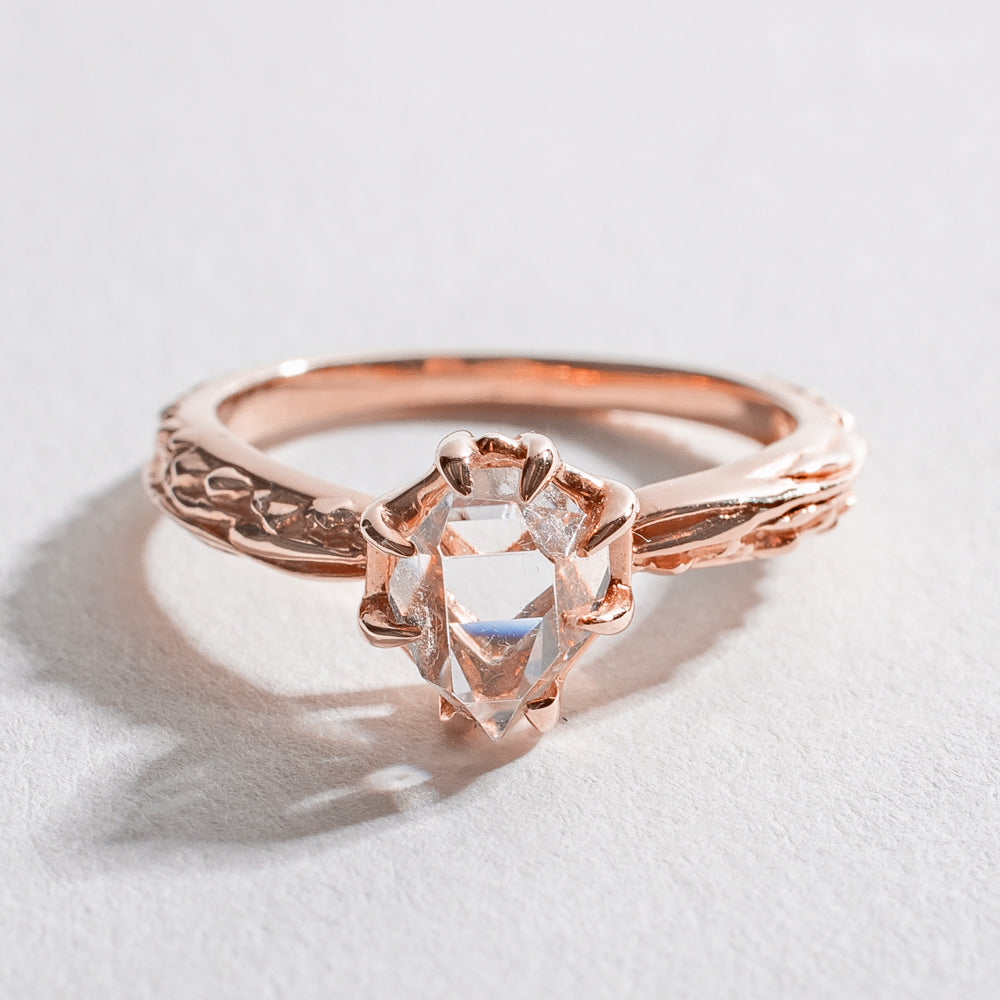 A solid rose gold textured ring that varies from 2-3mm in width with one natural Herkimer Diamond (roughly 6x8mm) that rests 6mm above the finger.