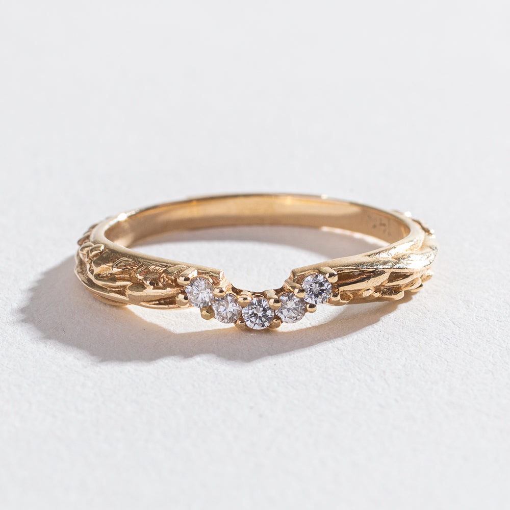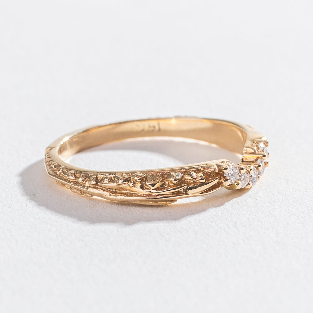 A solid 14K Yellow gold textured band that varies from 2-3mm in width with five 1.7mm lab grown Moissanites (.11ct) that rest 2.5mm above the finger.