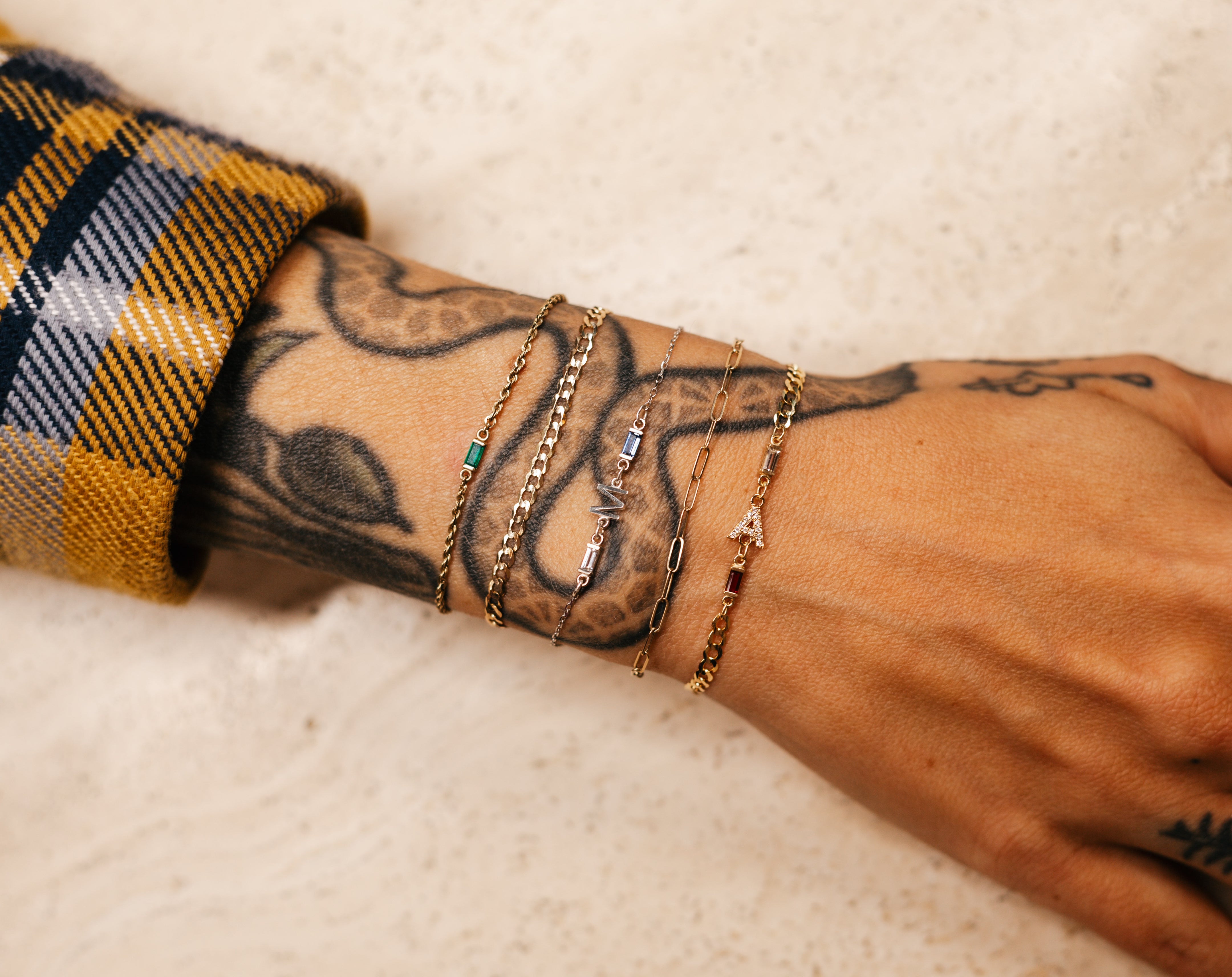 Build your own custom permanent jewelry from our array of 14K Gold Initials, Pavé Diamond Initials, and Hand-set Birthstone Connectors below. Mix and match to your heart's content, then proceed to checkout and select "Pick Up" delivery.