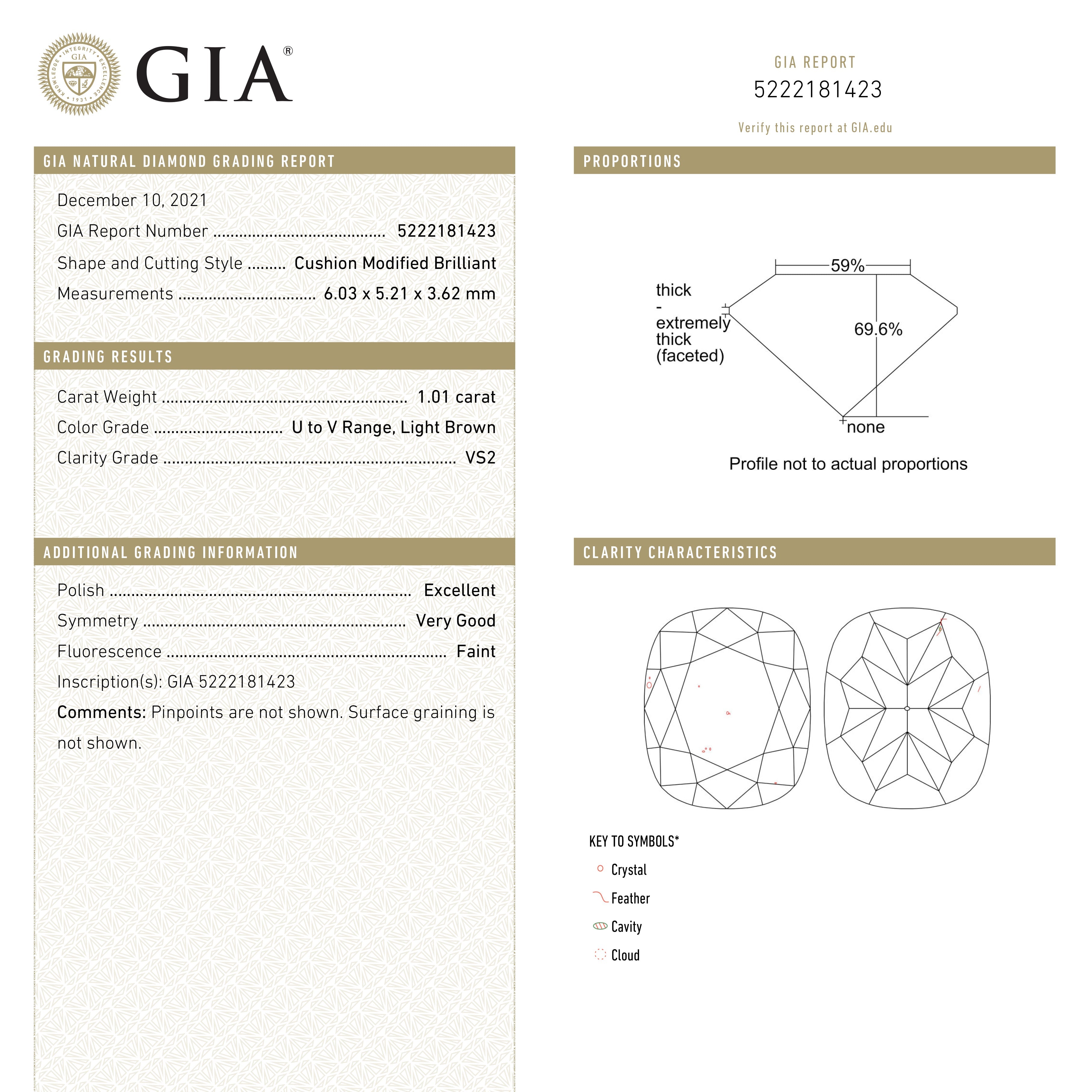 1.01ct 6.03x5.21x3.62mm GIA VS2 Champagne Cushion Brilliant 21596-01