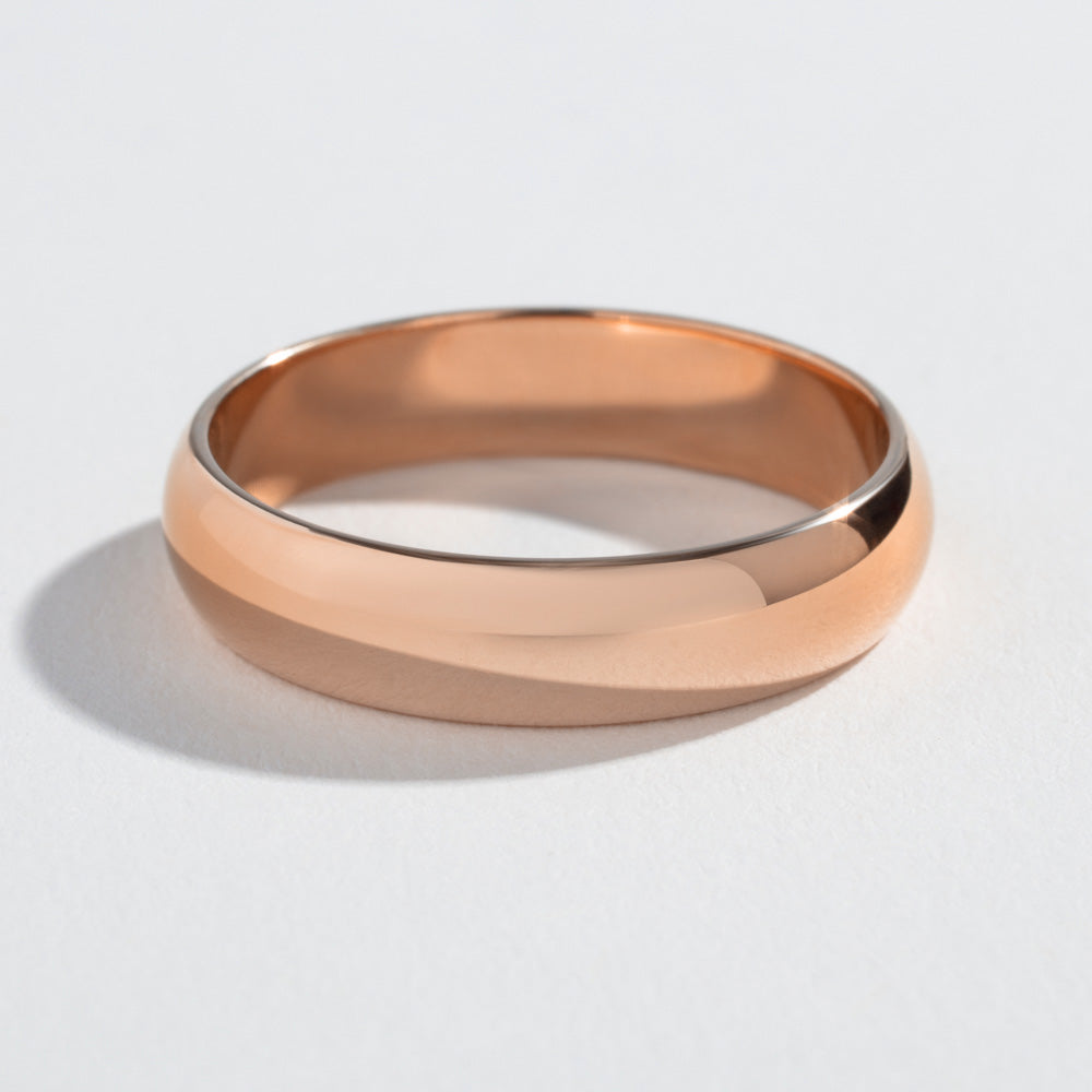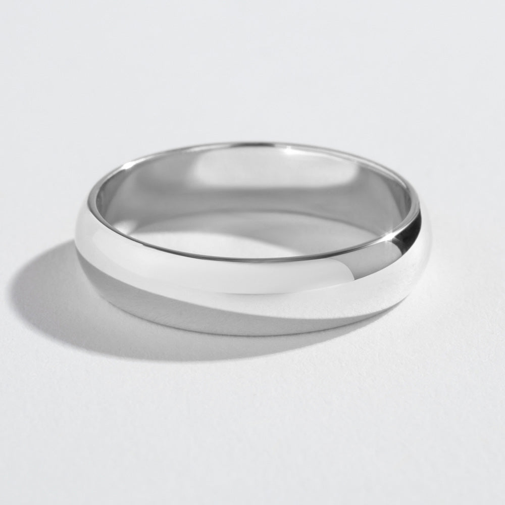 This 5mm wide band is a classic, irreplaceable design. Featuring a half round exterior, this high gloss band is one of the most recognizable wedding band styles. This timeless design will also act as a good basic to round out your jewelry collection with.
