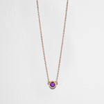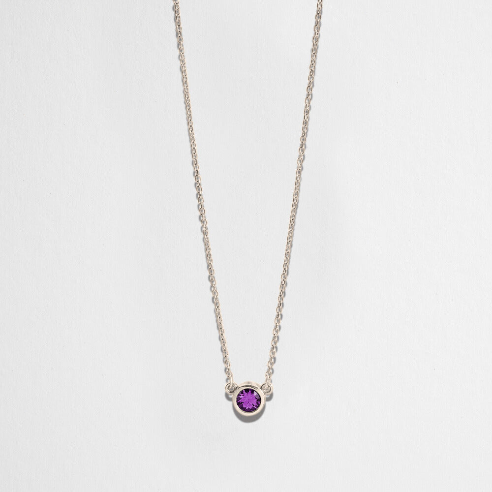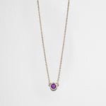 Always elegant. Always classic. The Angela Monaco Jewelry Bezel Necklace features a 4mm round, bezel set with a natural Amethyst on a 16" chain.  Amethyst, a February Birth Stone has healing properties that aid in anxiety, and sleep patterns and help ease tension in the mind and body.