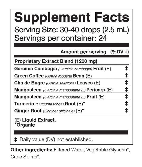 We live in a world where there is an abundance of bad fats within the marketplace. And they make it through into our life often unperceived and in the most unexpected ways. Many of the oils we buy at grocery stores are rancid, heated at high temperatures where their nutrient density is destroyed, or are simply refined or saturated fats. Overtime this taxes our liver and can cause a bunch of common side-effects such as bloating, gas, allergies, stagnation, backed up metabolism and more. MSRP: $29-30.00 Ingredients: Garcinia (Garcinia cambogia) Fruit (E), Green Coffee (Coffee arabica L.) Bean (E), Cha de Bugre (Cordia salcifolia) Leaf (E), Mangosteen (Garcinia mangostana L.) Pericarp (E), Mangosteen (Garcinia mangostana L.) Fruit*, Turmeric (Curcuma longa) Root (E)*, Ginger (Zingiber officinale) Root (E)*, Hibiscus (Hibiscus sabdariffa) Flower (E) Other Ingredients: Filtered Water, Vegetable Glycerin*, Cane Spirits* *Organic / (E) Liquid Extract