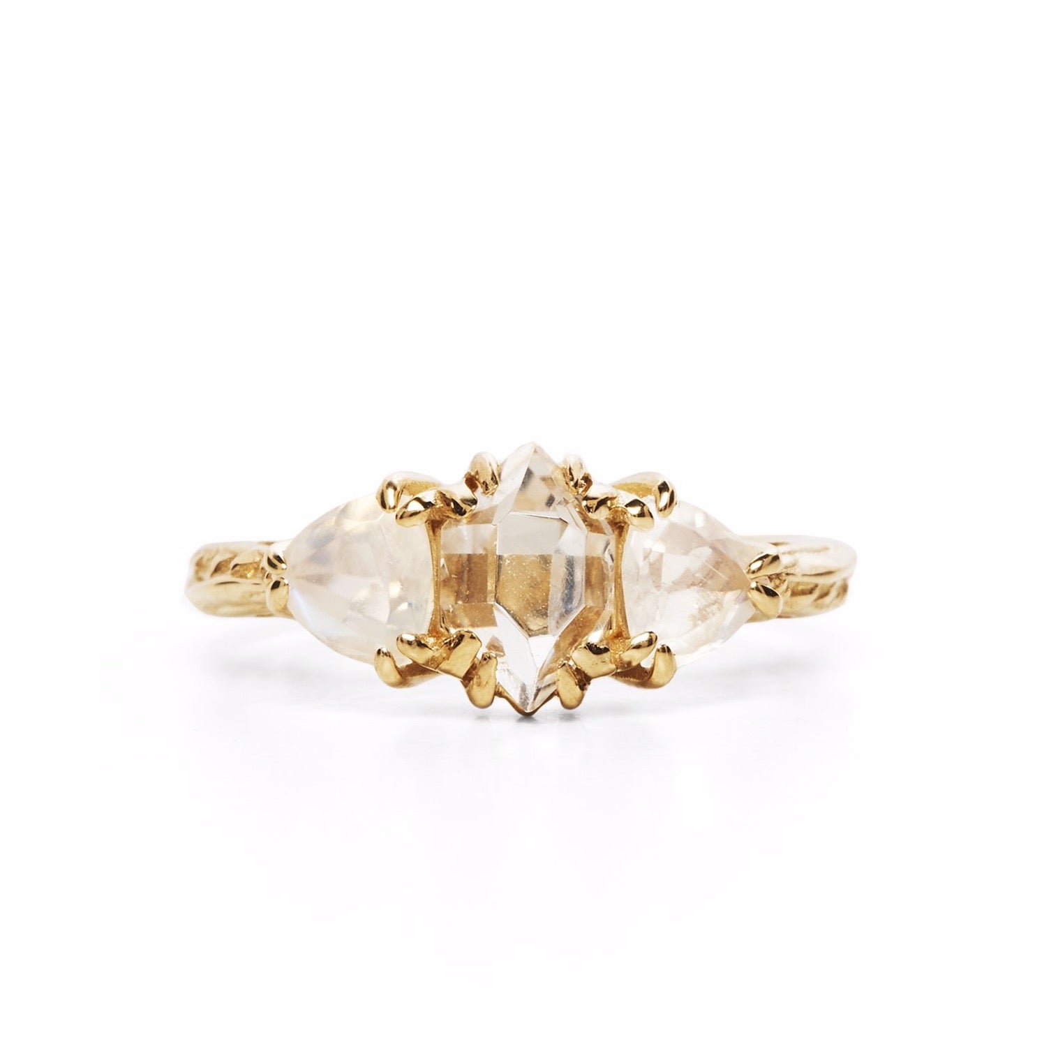 Solid 14k yellow gold, raw Herkimer Diamond measures approximately 6mm, flanked by two 5mm trillion cut moonstones. The setting sits approximately 5mm above the finger and the band delicately textured.