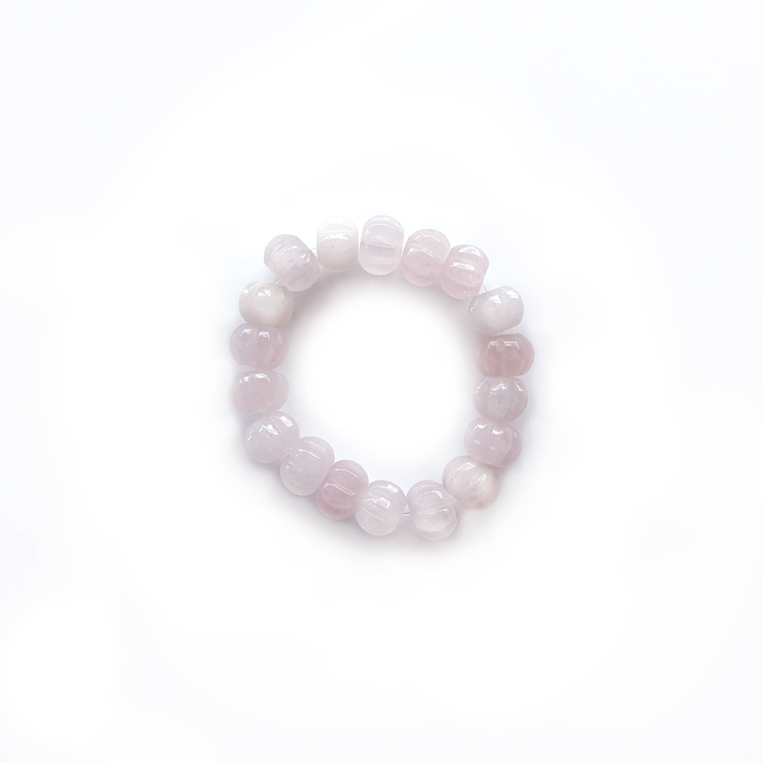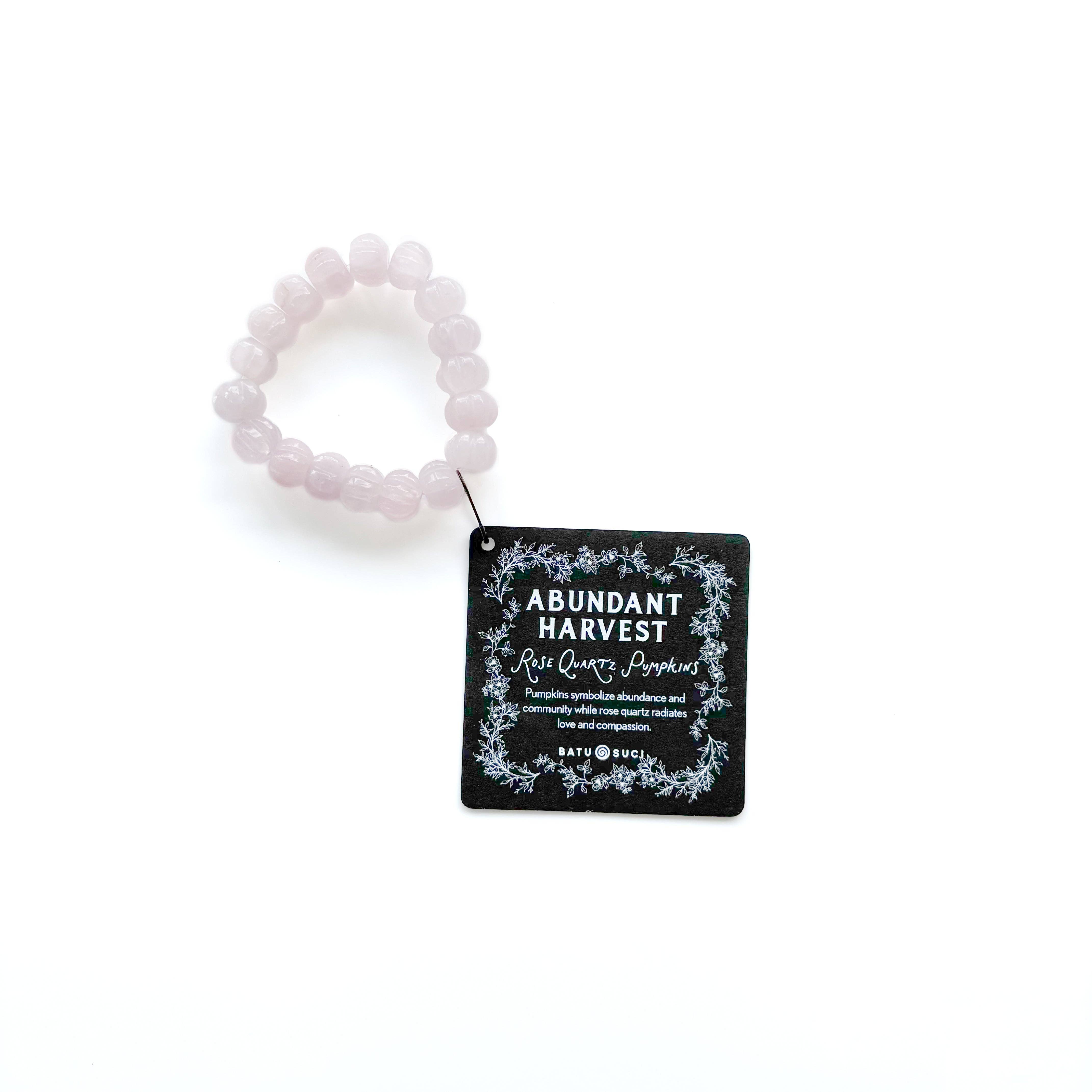 The Abundant Harvest bracelet features delicate pumpkin-shaped beads carved from warm, blush-toned rose quartz — a stone known for its gentle energy of love, compassion, and emotional healing.