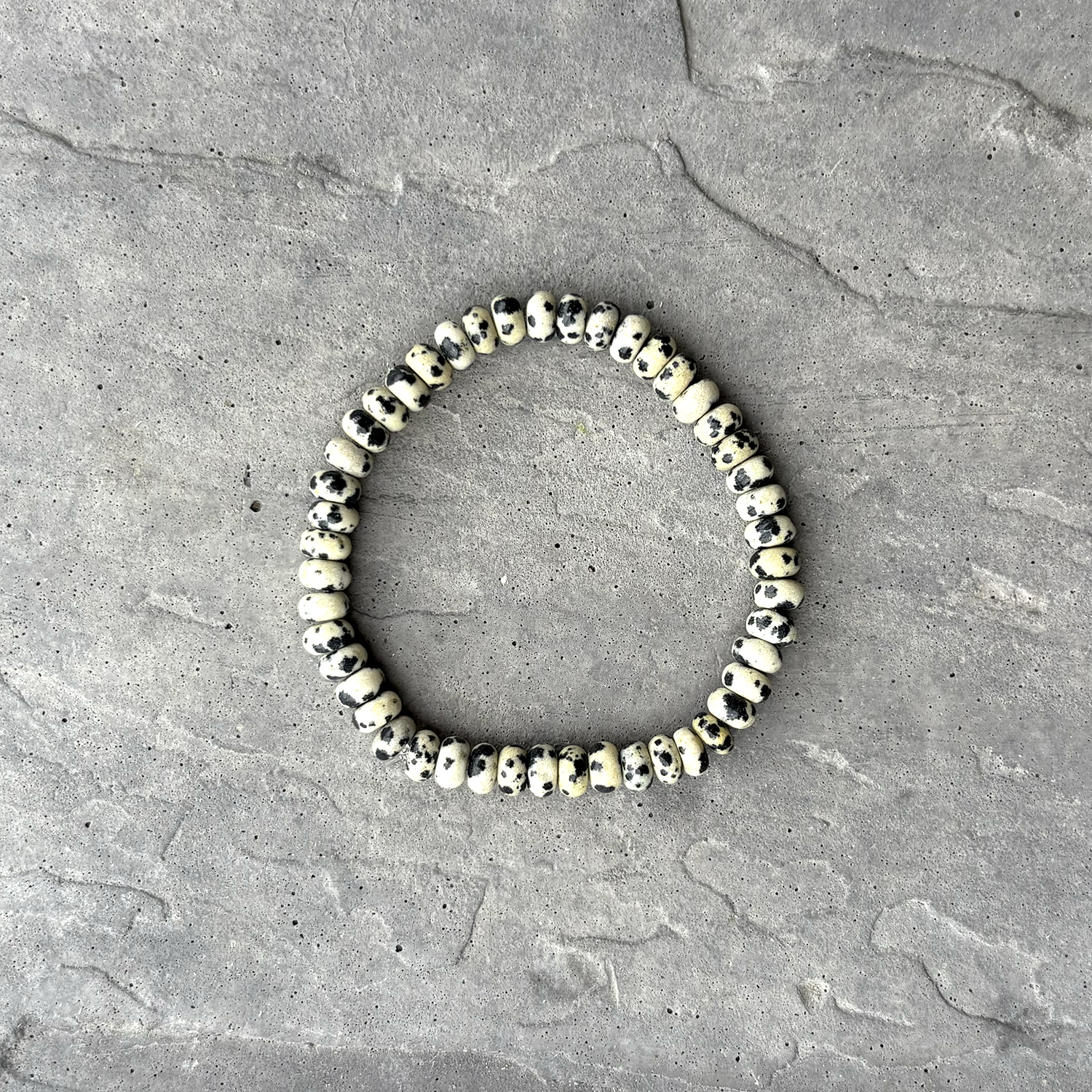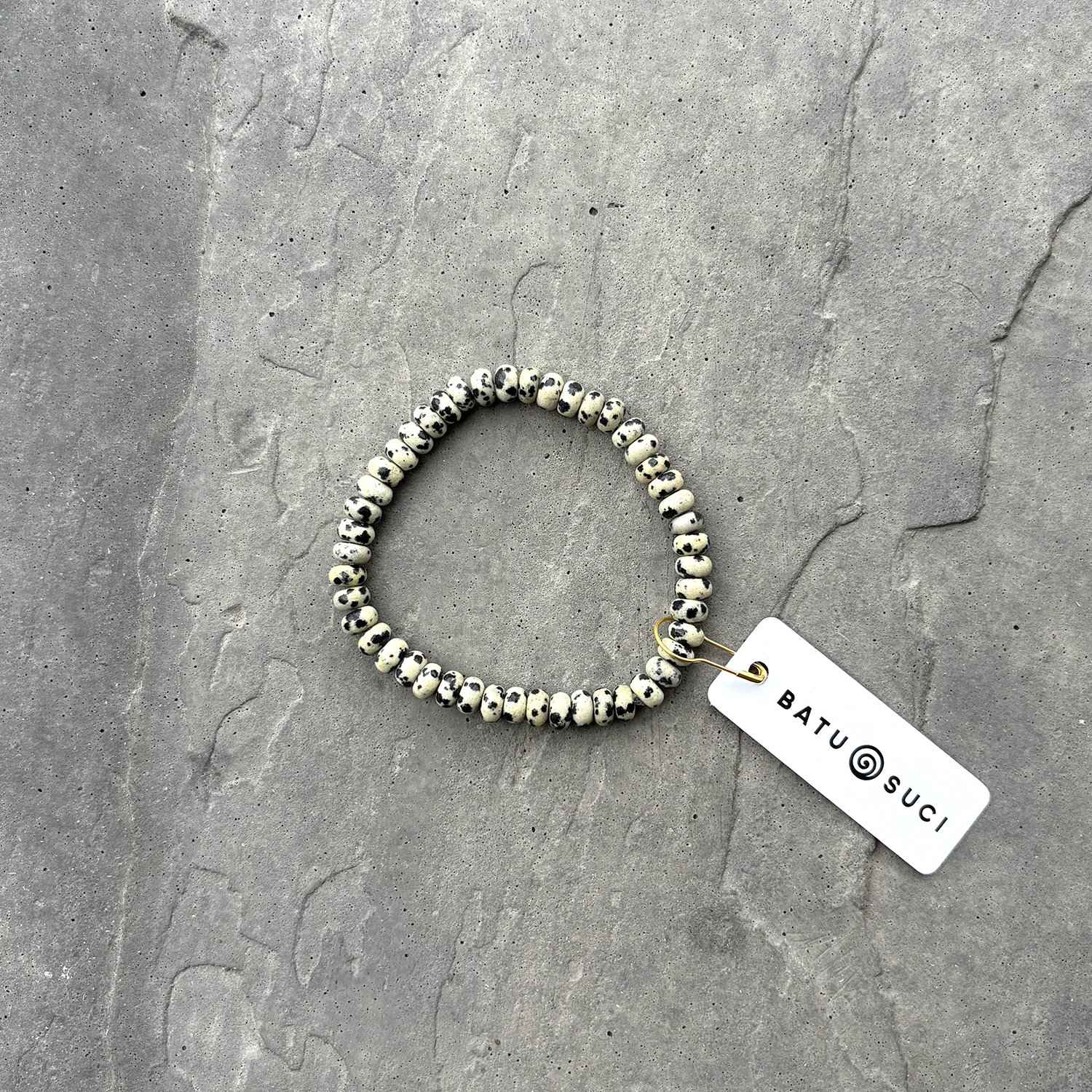 Spotted and spirited. This bracelet features 6mm Dalmatian Stone rondelle beads, each one speckled with personality. Known for its grounding energy and playful vibe, Dalmatian Stone is believed to help break down barriers, boost joy, and encourage a sense of lighthearted adventure. 🔥 Once it's gone, it's gone. The maker won’t be restocking. Snag yours before it slips away! Comes with small Batu Suci tag and attached with a gold safety pin.