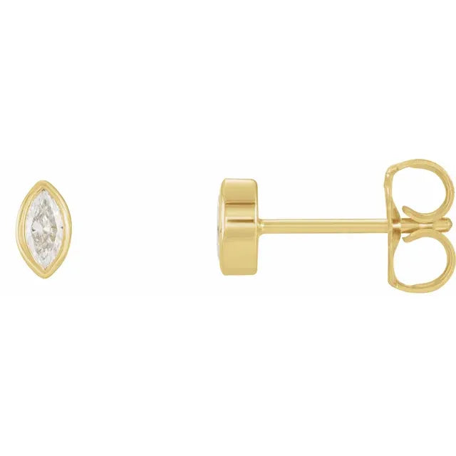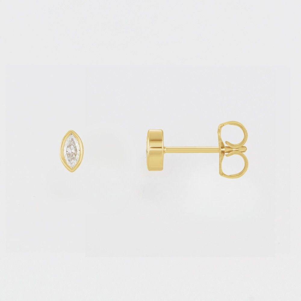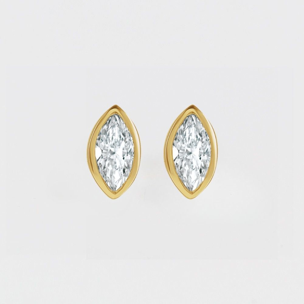 Elegant marquis-cut diamond studs set in lustrous 14K gold. The bezel setting secures each stone while creating a sleek, modern silhouette that catches light beautifully.
