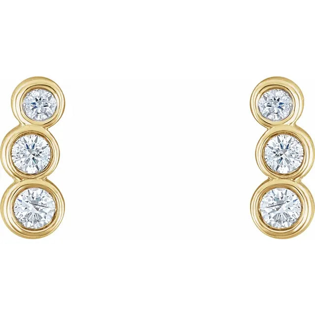 Elegant three-stone design with secure bezel settings that frame each stone beautifully. These climber studs sit gracefully along the ear, combining timeless sophistication with modern comfort.
