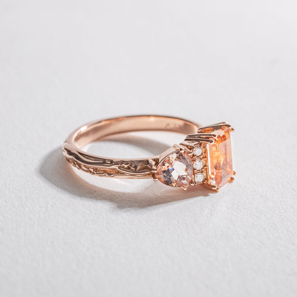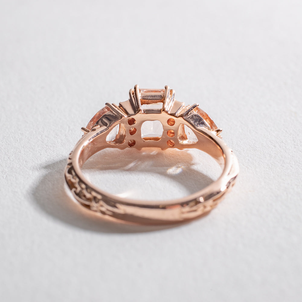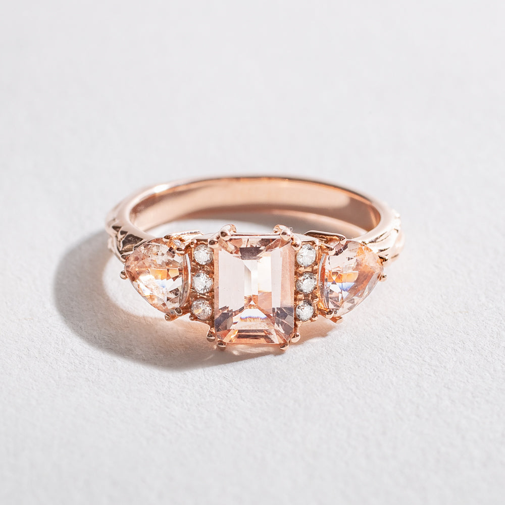 Solid 14k Rose Gold. 5x7mm Morganite, flanked by six 2mm White Diamonds and two 5mm trillion-cut Morganite.