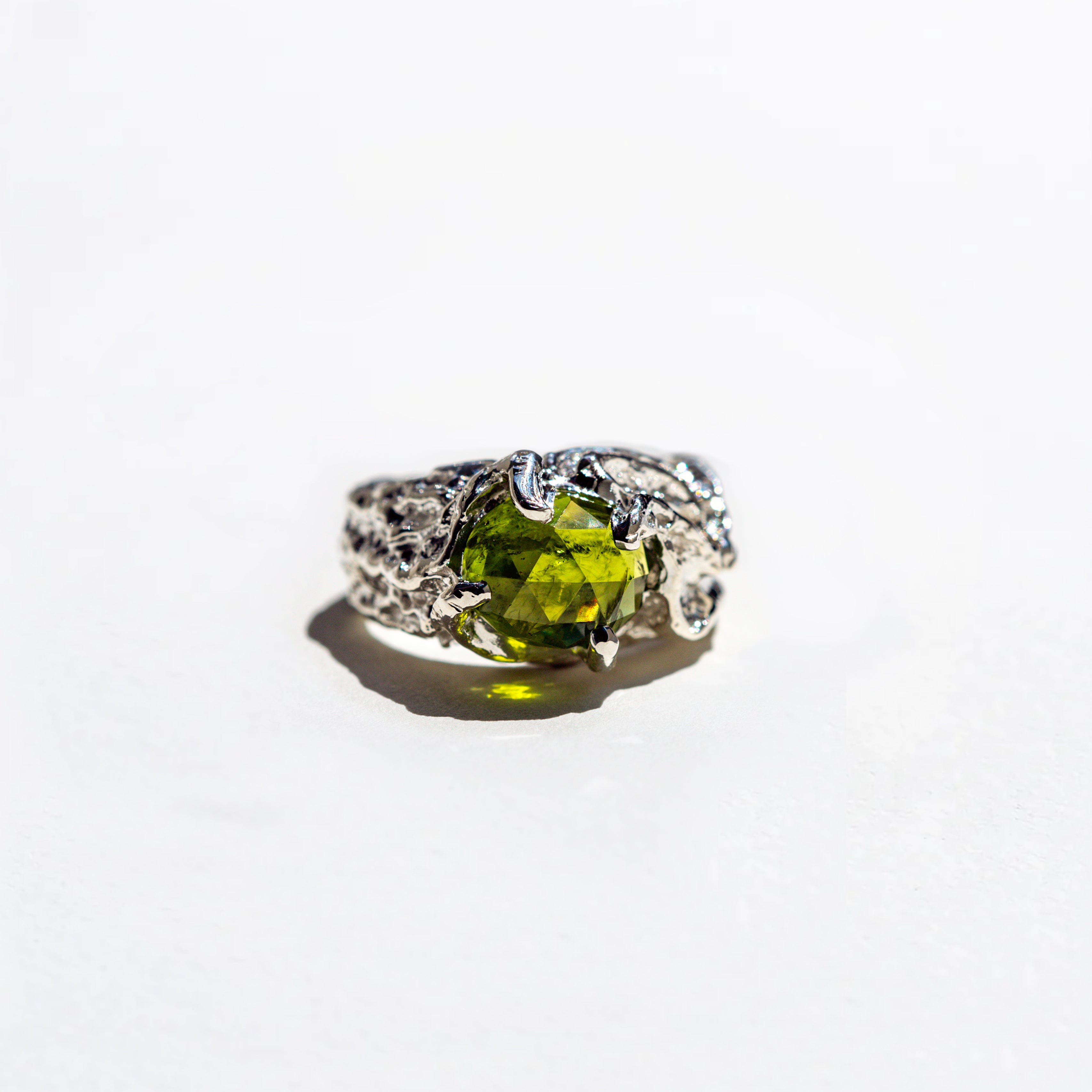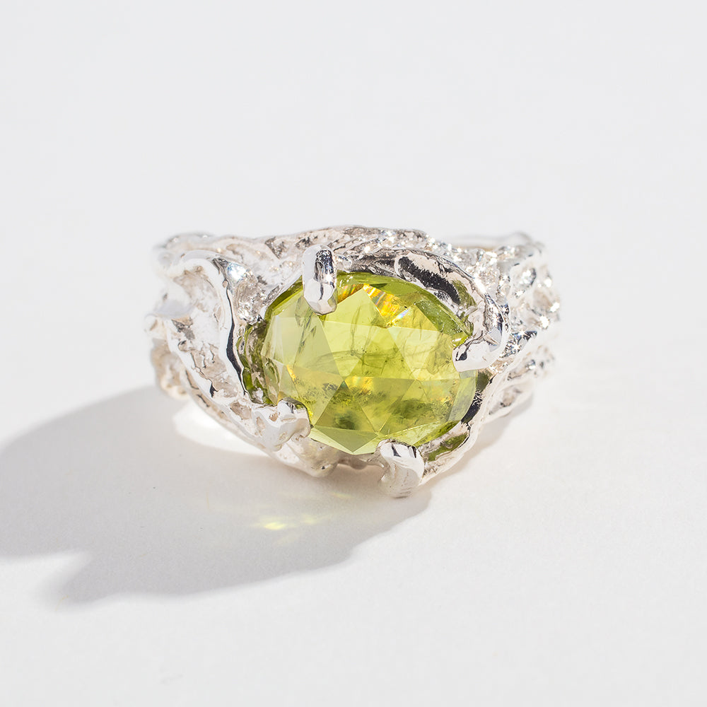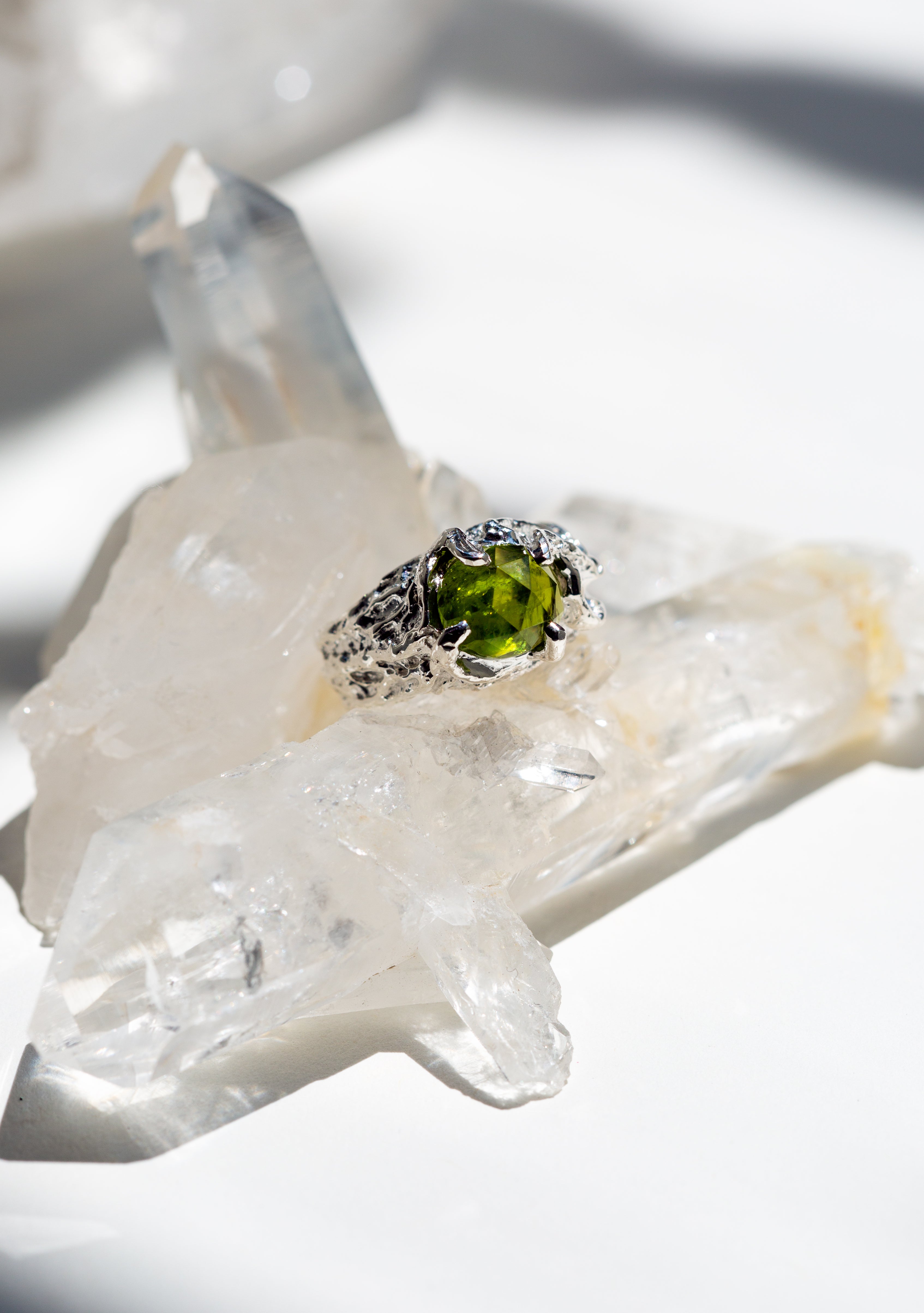Angela Monaco's Caldera ring - now with a twist! Peridot is a cheery, green stone that promotes healing, rest, and creativity.