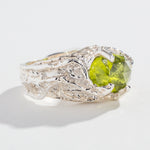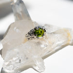 Please note that each Peridot stone used in this ring will be one-of-a-kind. Due to the nature of these stones, each stone will vary in color, hue, radiance, shape, and size.