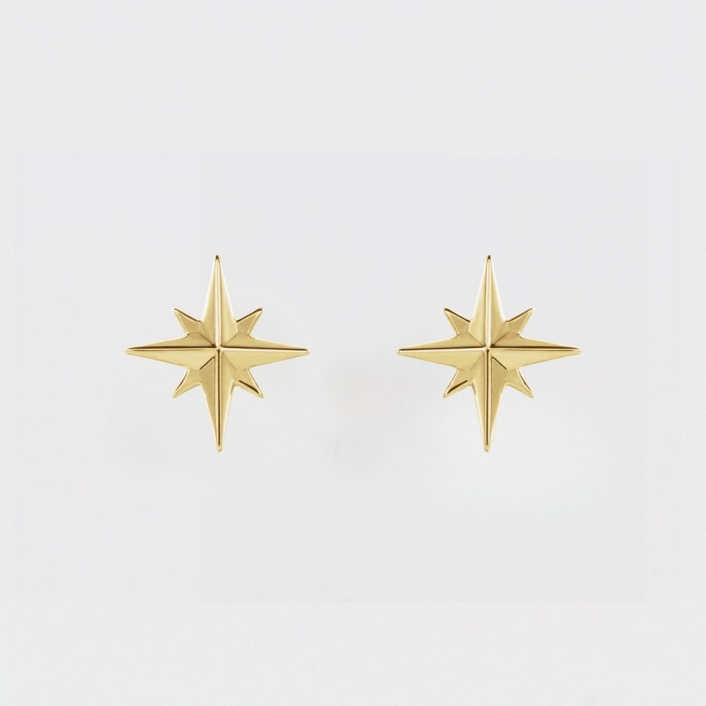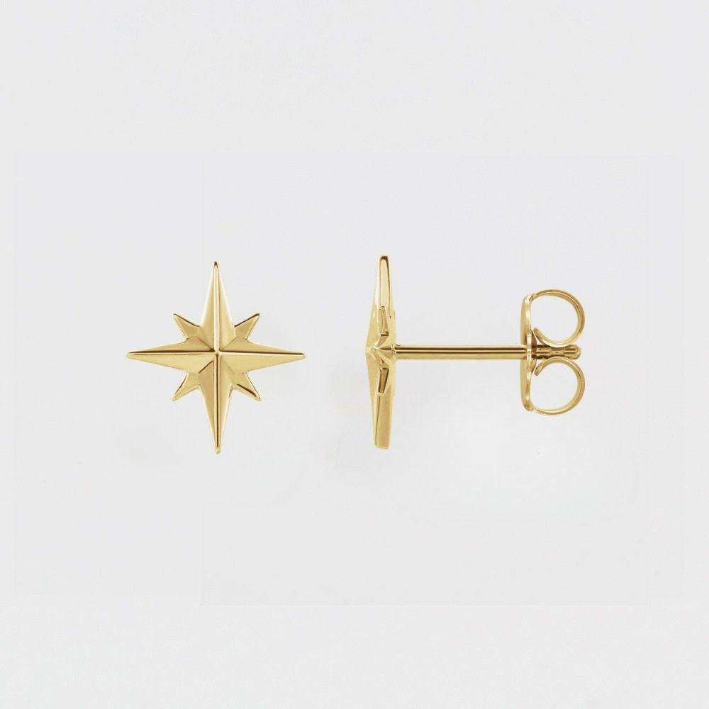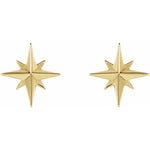 Delicate 14k yellow gold studs inspired by celestial motifs. Perfect for everyday wear or layering, these timeless pieces add a subtle touch of cosmic elegance to any look.