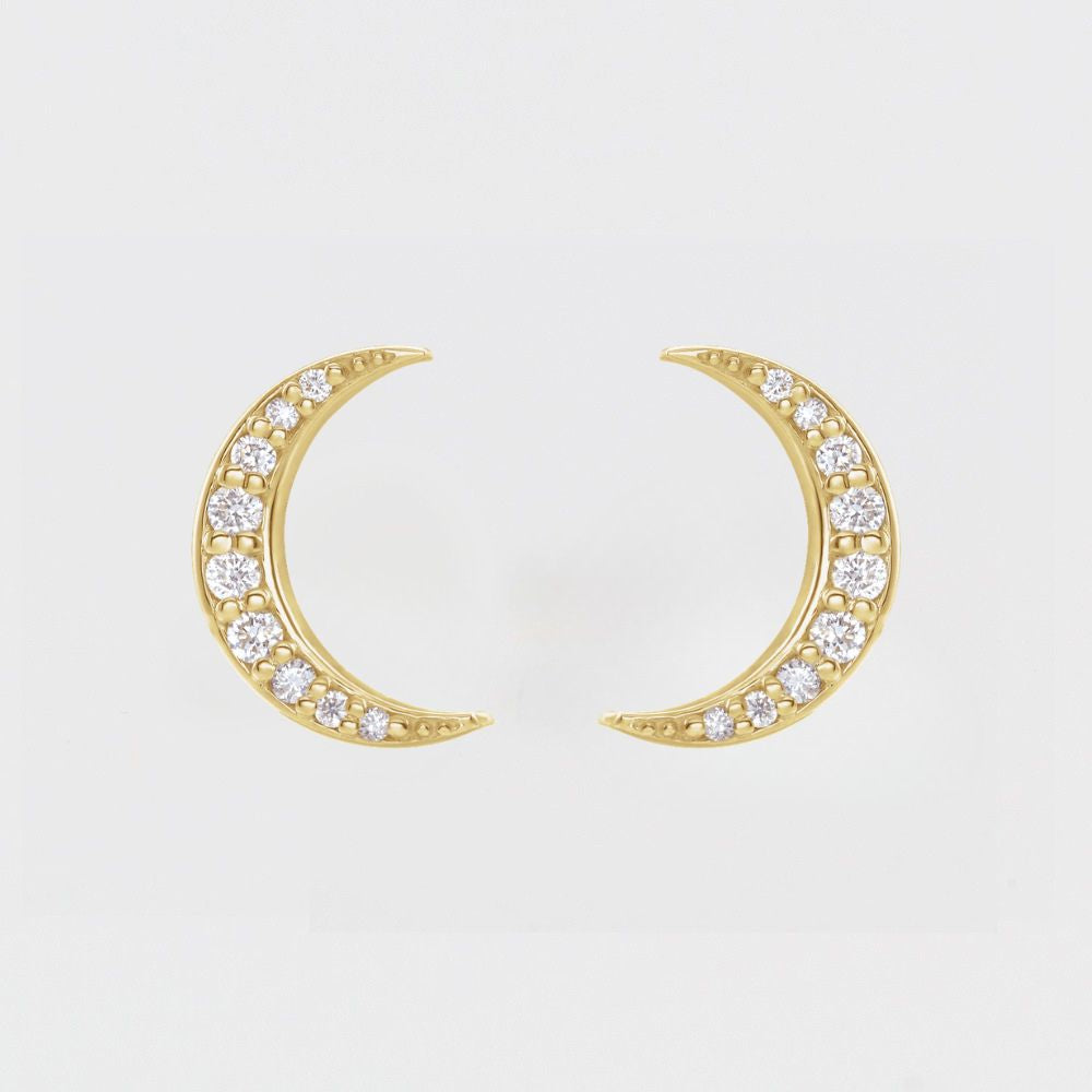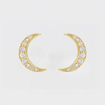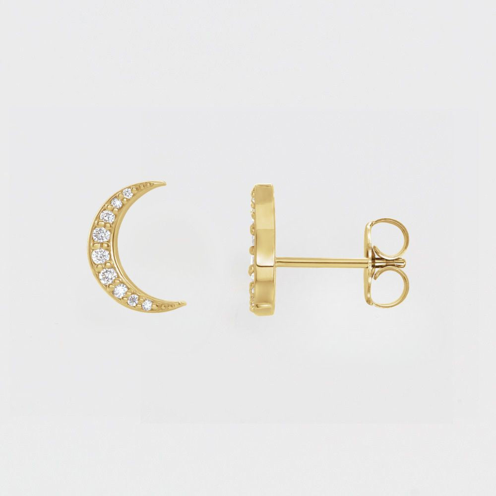 Delicate crescent moon studs crafted in 14K gold, each adorned with natural diamonds.