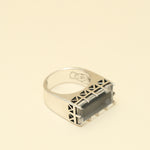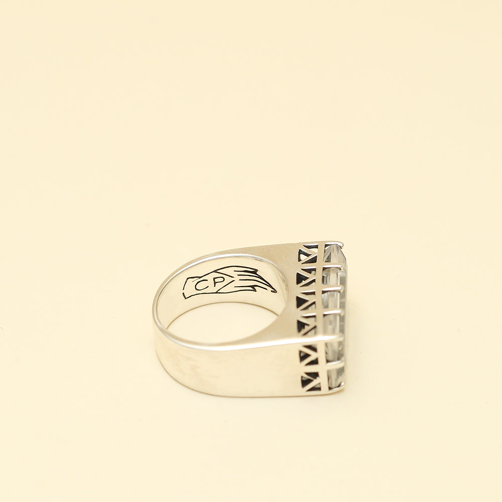 Designed to celebrate our love for both the East and West Coasts, the East West Statement Ring in silver and clear quartz features a faceted clear quartz stone and Angela Monaco Jewelry’s signature protection symbol engraved on the inside of the oxidized sterling silver band.