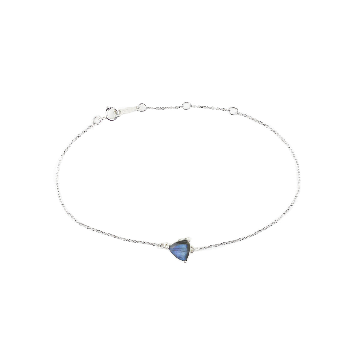 Measuring 7" in length with adjustable 0.5" additional loop for 6.5" length. Made in sterling silver with one 7mm trillion faceted Labradorite.