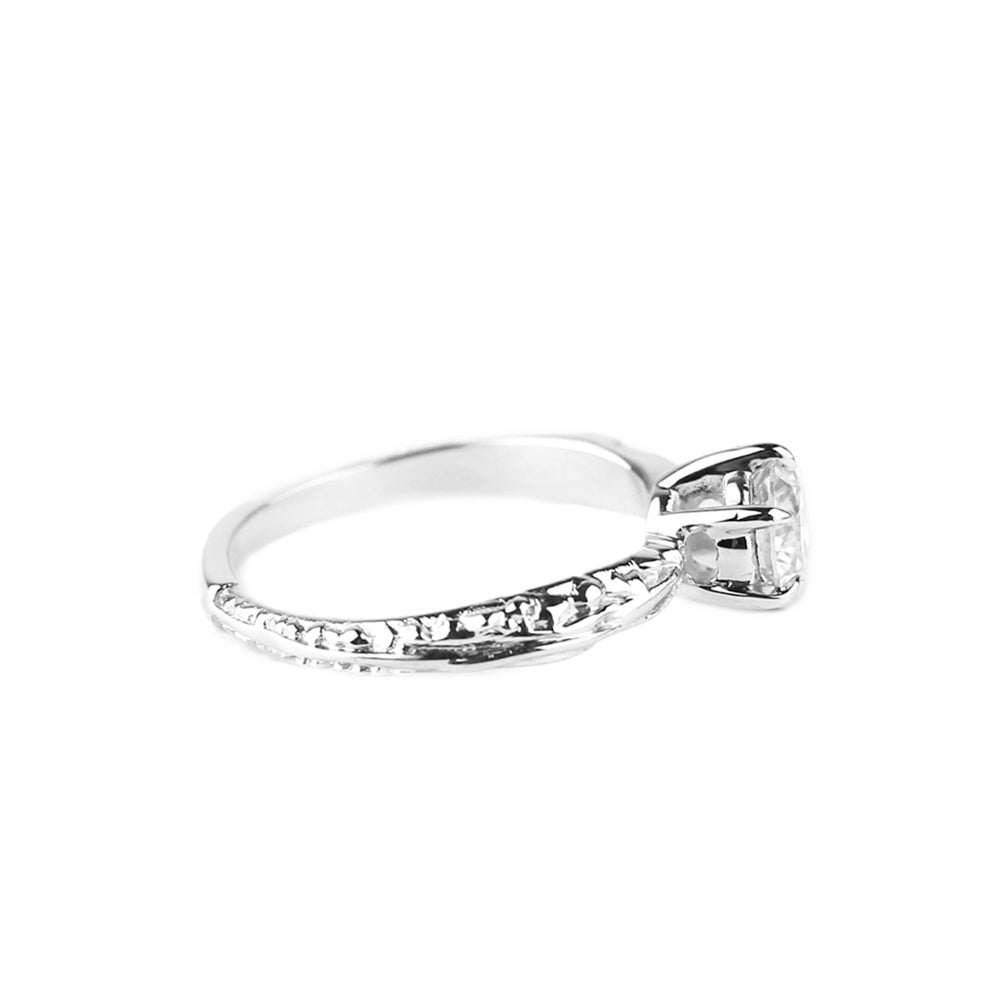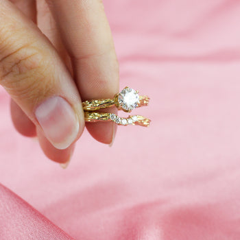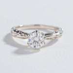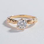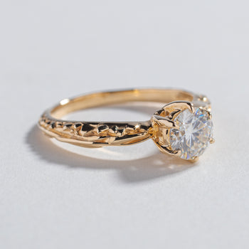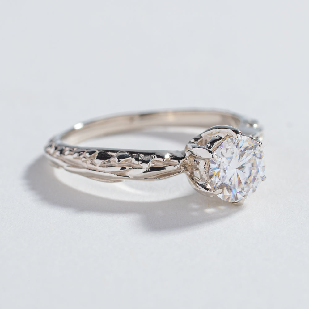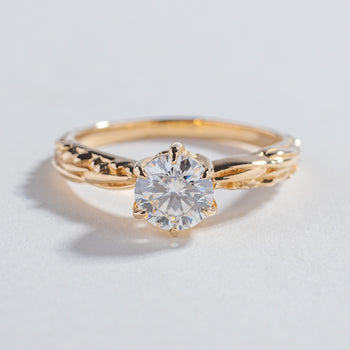 Our signature solitaire engagement ring with our exclusive crystalline and roots texture along the band.  Sits high enough to make an impact of sparkle while still being comfortable for every day wear.  Stacks perfectly with the Pave matrix contour band.