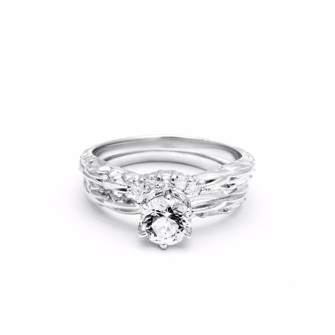 A solid white gold textured band that varies from 2-3mm in width with one 6mm round faceted Herkimer diamond that rests 6mm above the finger.