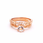 A solid 14k yellow gold textured band that varies from 2-3mm in width with one 6mm round faceted Herkimer diamond that rests 6mm above the finger.