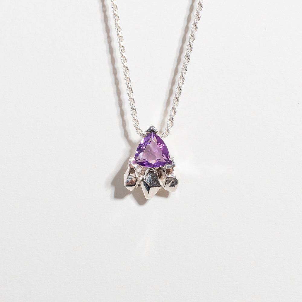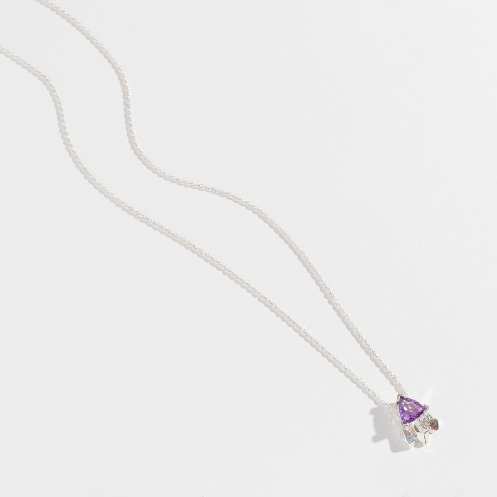 7mm Trillion faceted Amethyst gemstone. 18" Sterling silver foxtail chain.