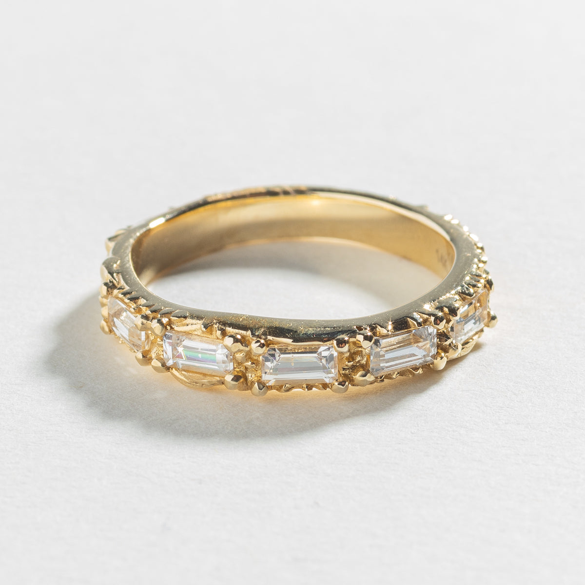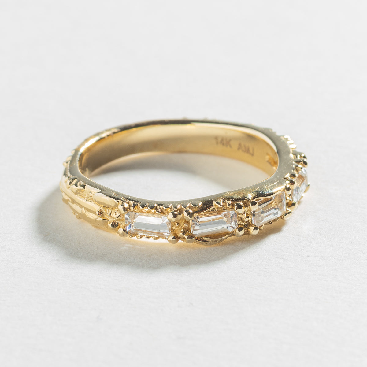 Featuring our signature crystalline and earthy texture flow, 7/8's around the band leaving room for a sizing bar, five 2x4mm natural cut White Sapphire baguettes are set within the rocky texture as if they grew out of it.