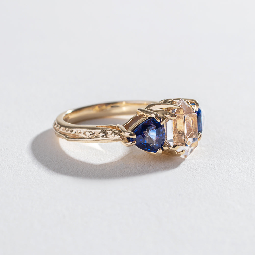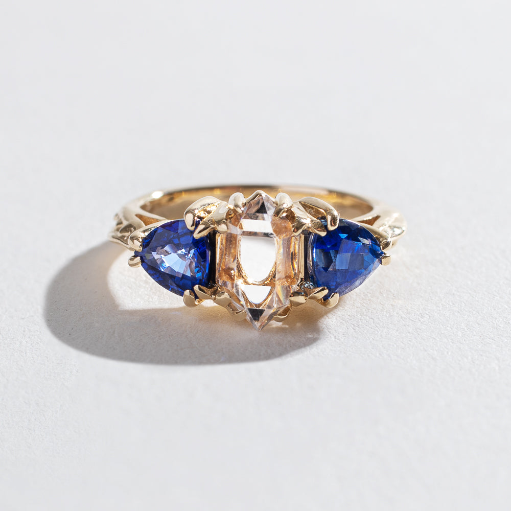 HERKIMER DIAMOND AND SAPPHIRE THREE STONE ENGAGEMENT RING