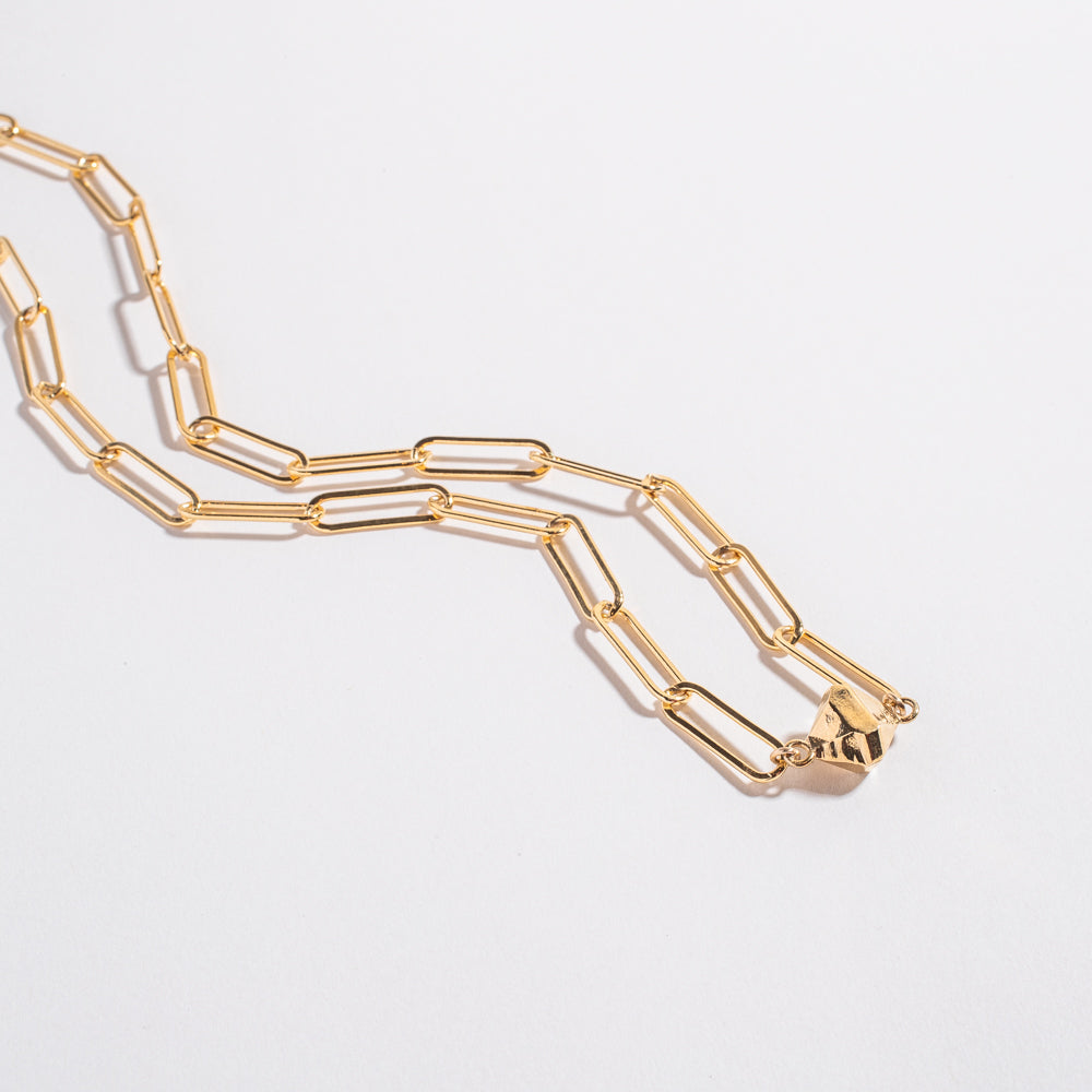 A solid sterling silver nugget attached to a gold vermeil 18-inch paperclip chain