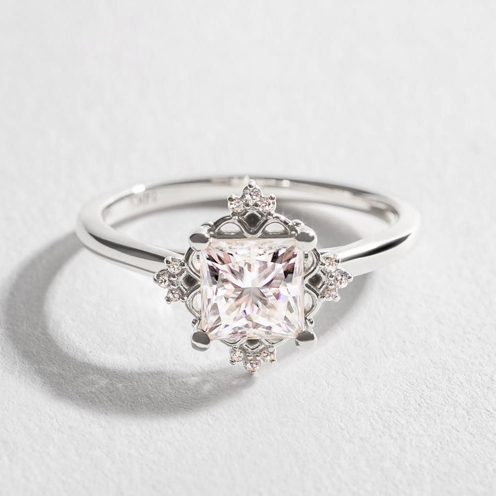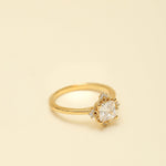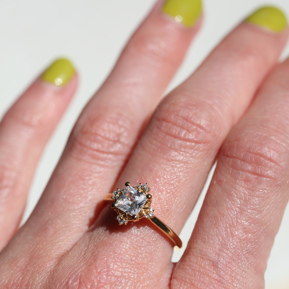 Just when you thought a Halo wasn't your style this magical yet timeless engagement ring popped into your life. Literally! We have chosen to set this ring with a sustainable Lab-grown Moissanite but you could get any stone your heart desires.  Accompanied with small outburst of Melee Diamonds ethically sourced and ready to sparkle.