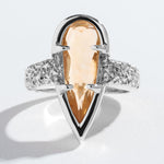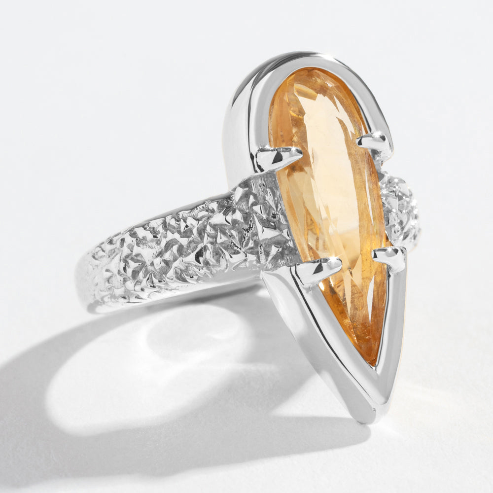 Elegant and classic ring design, sure to draw the eye in, features our signature rocky texture, set with a unique elongated pear shaped stone.