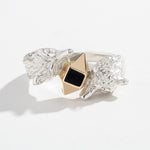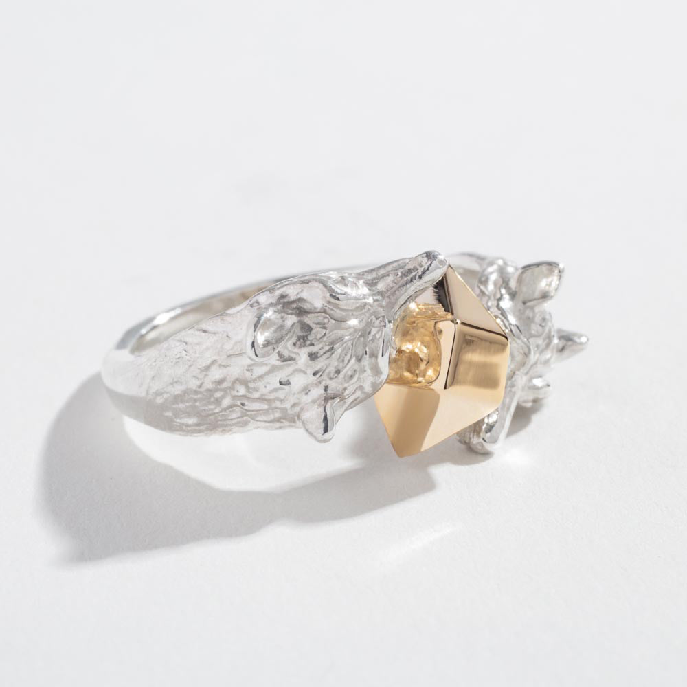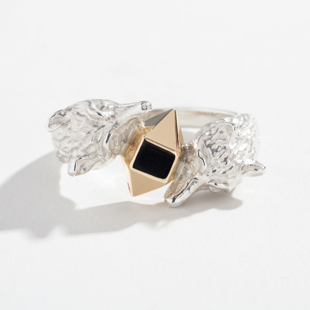 Handmade in sterling silver with a 14k gold vermeil hollow crystal. Wolf band can be plated in 14k yellow or rose gold vermeil.