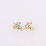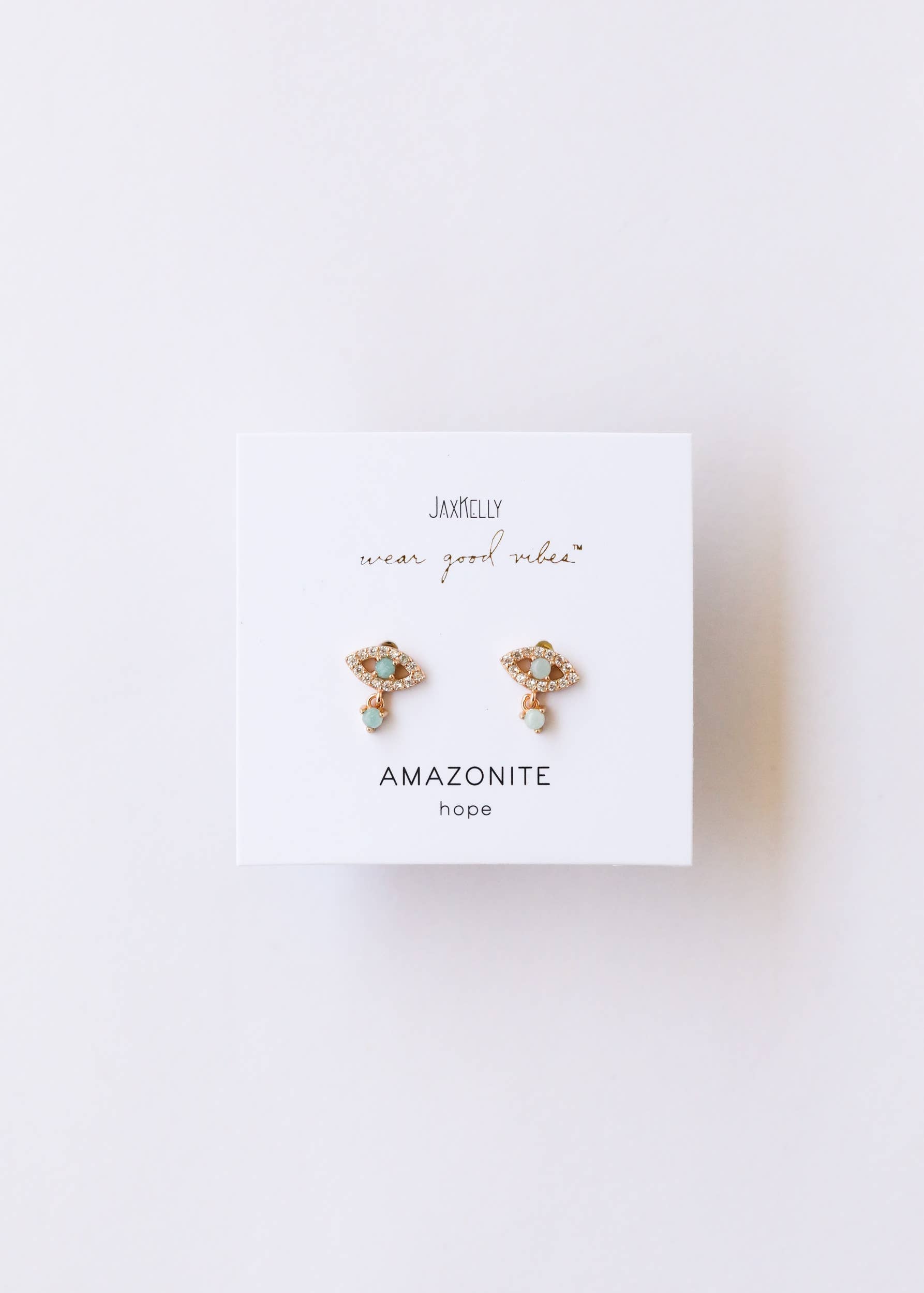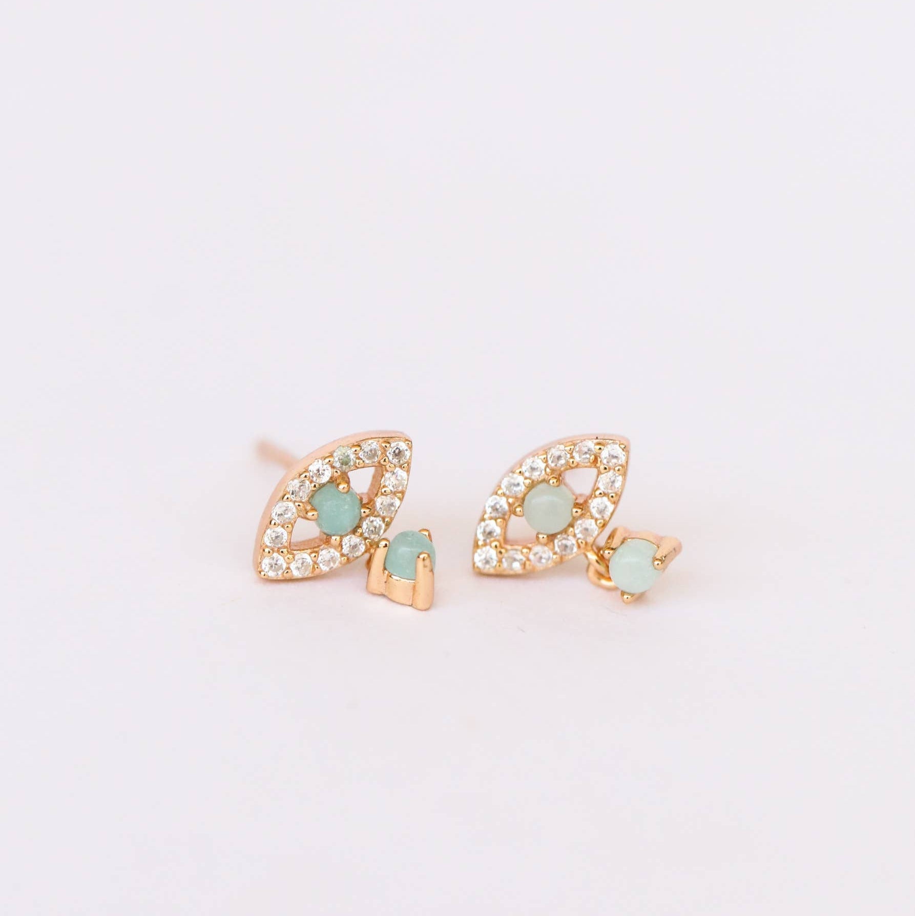 A CZ-encrusted evil eye stud has a petite gemstone hanging from the center. Amazonite is the hope stone, bringing optimism to difficult decisions by clearing away worries