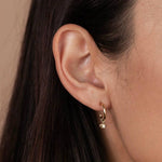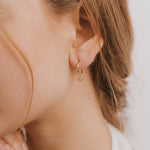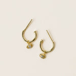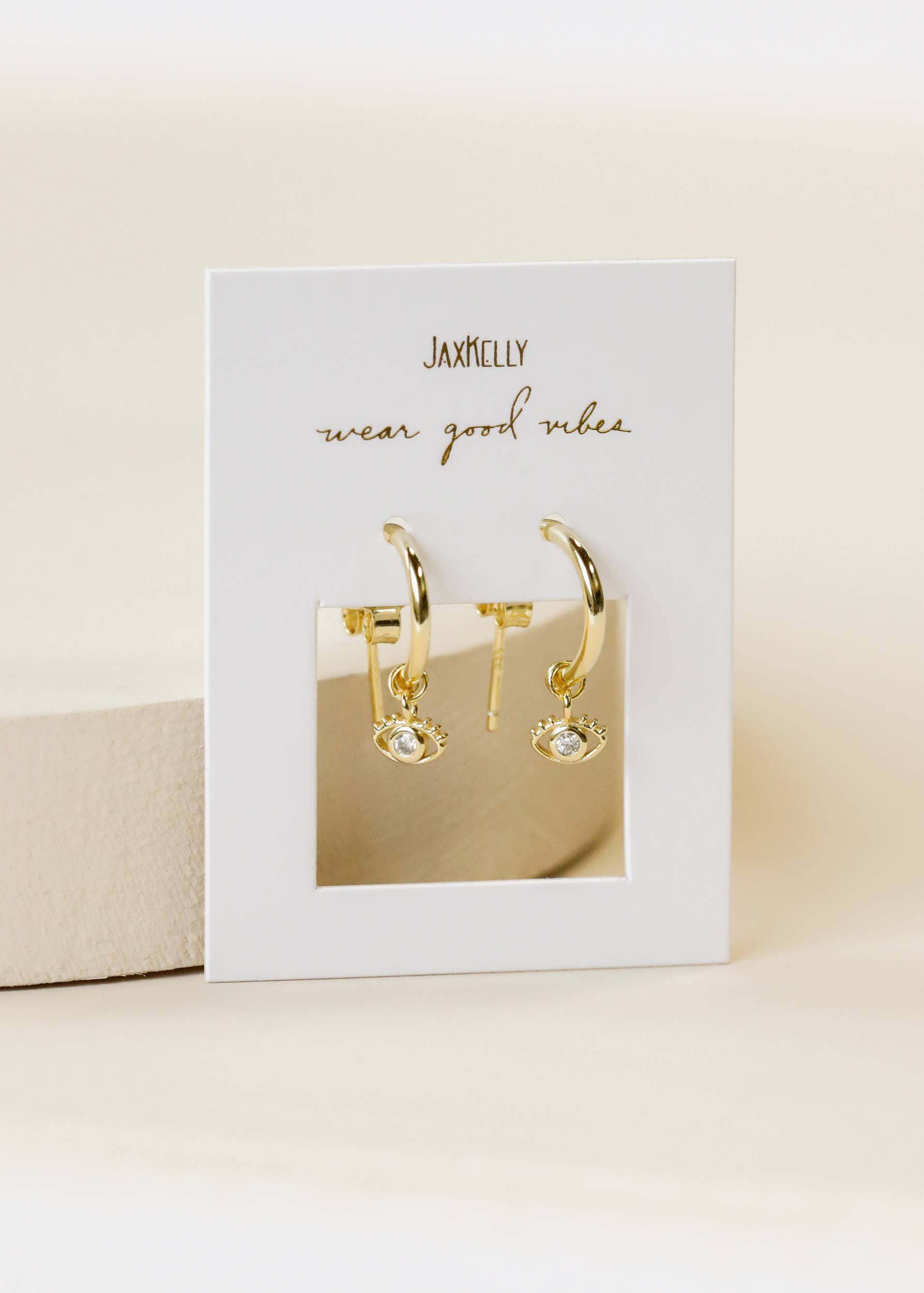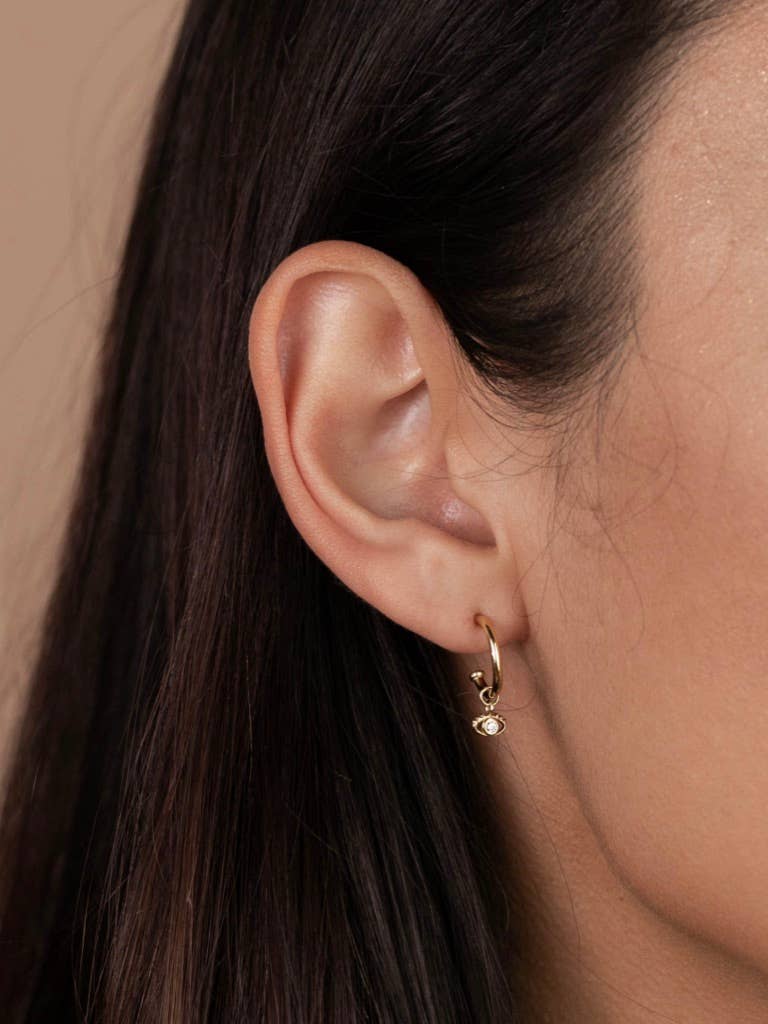 A gold hoop earring with a evil eye charm, featuring pave stones. Tarnish Free - Long lasting protective coating safeguarding your plated jewelry from sweat, water, and more.