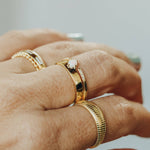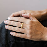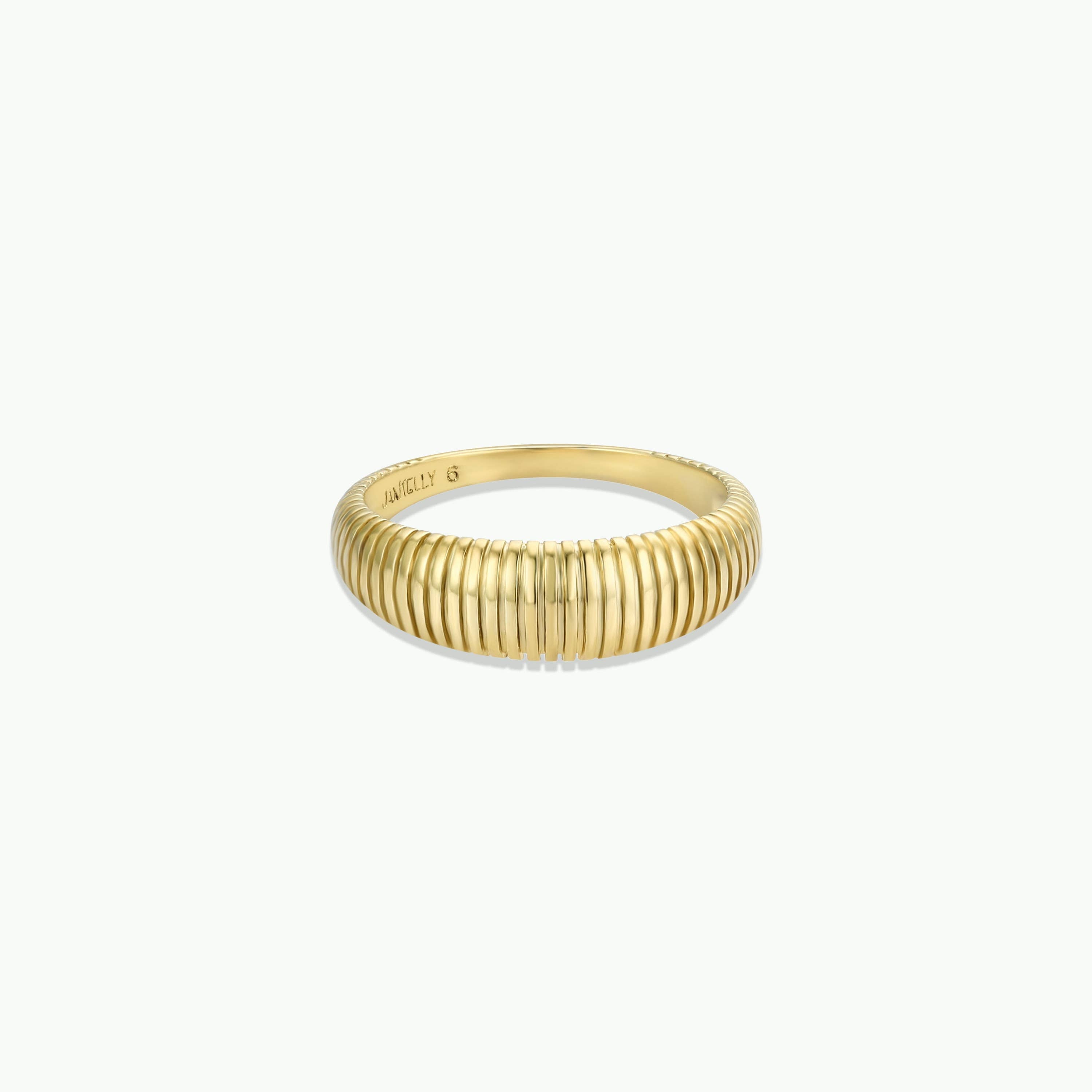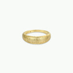 A sleek gold ring with etched ridges. Wear it alone or stack with your favorite bands. Matches perfectly with our ridged cuff. Tarnish Free - Long lasting protective coating safeguarding your plated jewelry from sweat, water, and more.