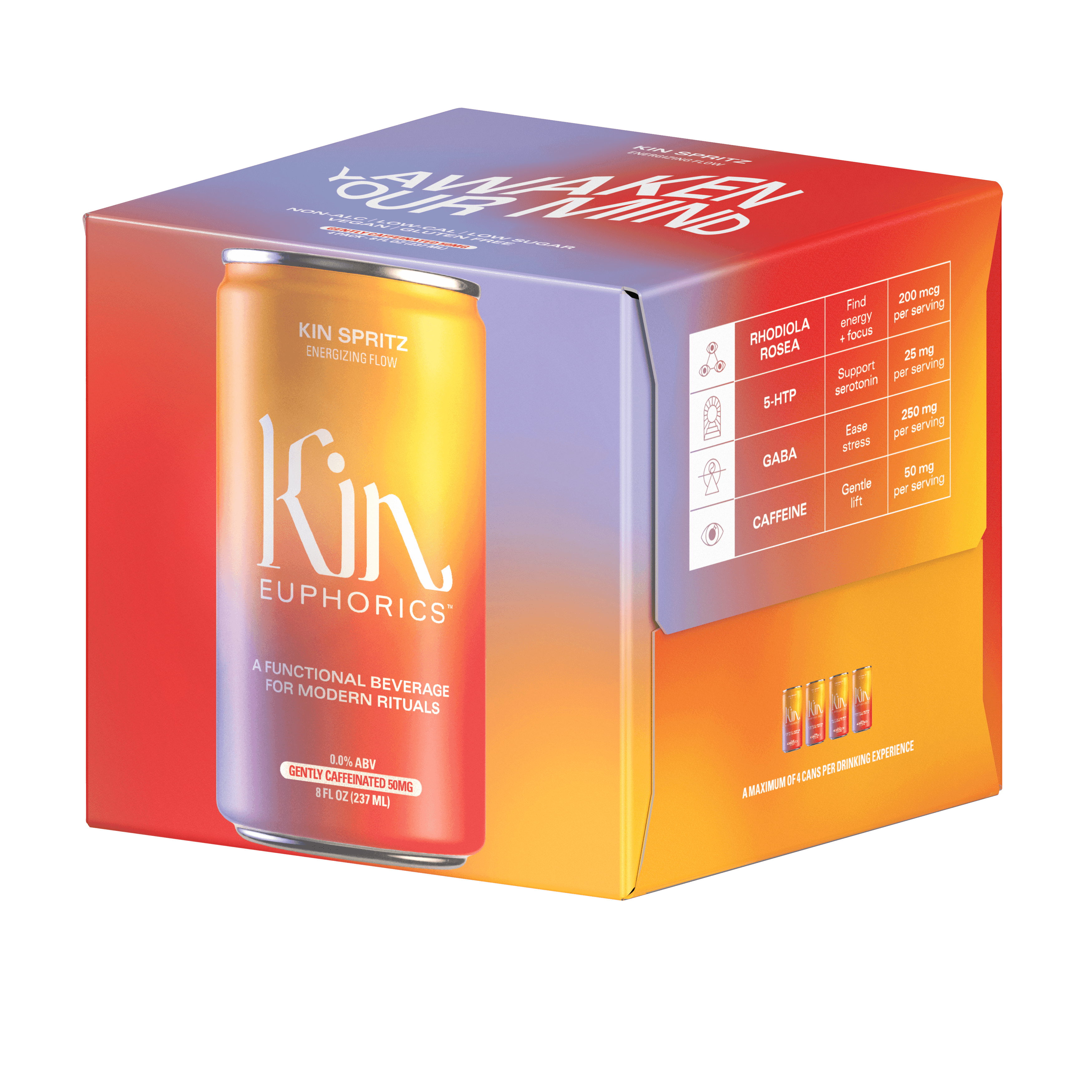 Untap good clean energy. Non-alcoholic and gently caffeinated Kin Spritz is infused with adaptogens, nootropics, and botanics like Rhodiola Rosea, 5-HTP, and Gaba to elevate your mood, smooth out stress, and offer a boost of energy.