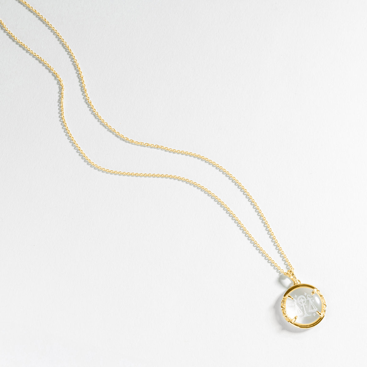 The Libra Zodiac Intaglio Necklace features a hand-carved quartz crystal depicting the balance scales — symbol of harmony, beauty, and aligned decision-making. This talisman invites you to trust your intuition and move with grace.