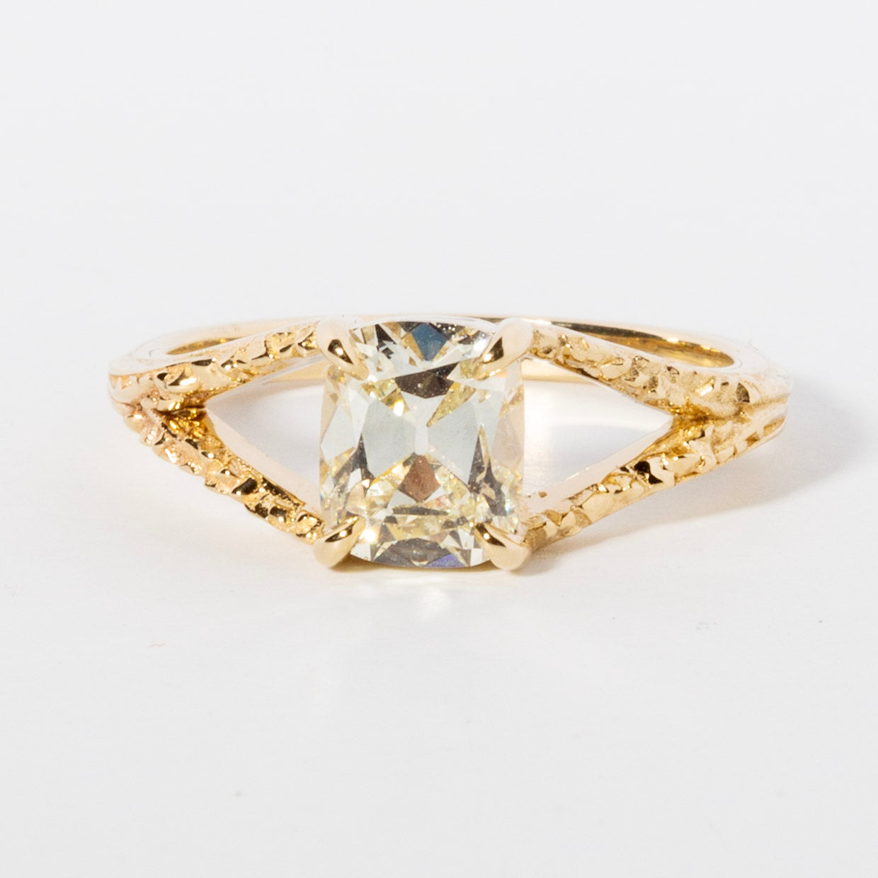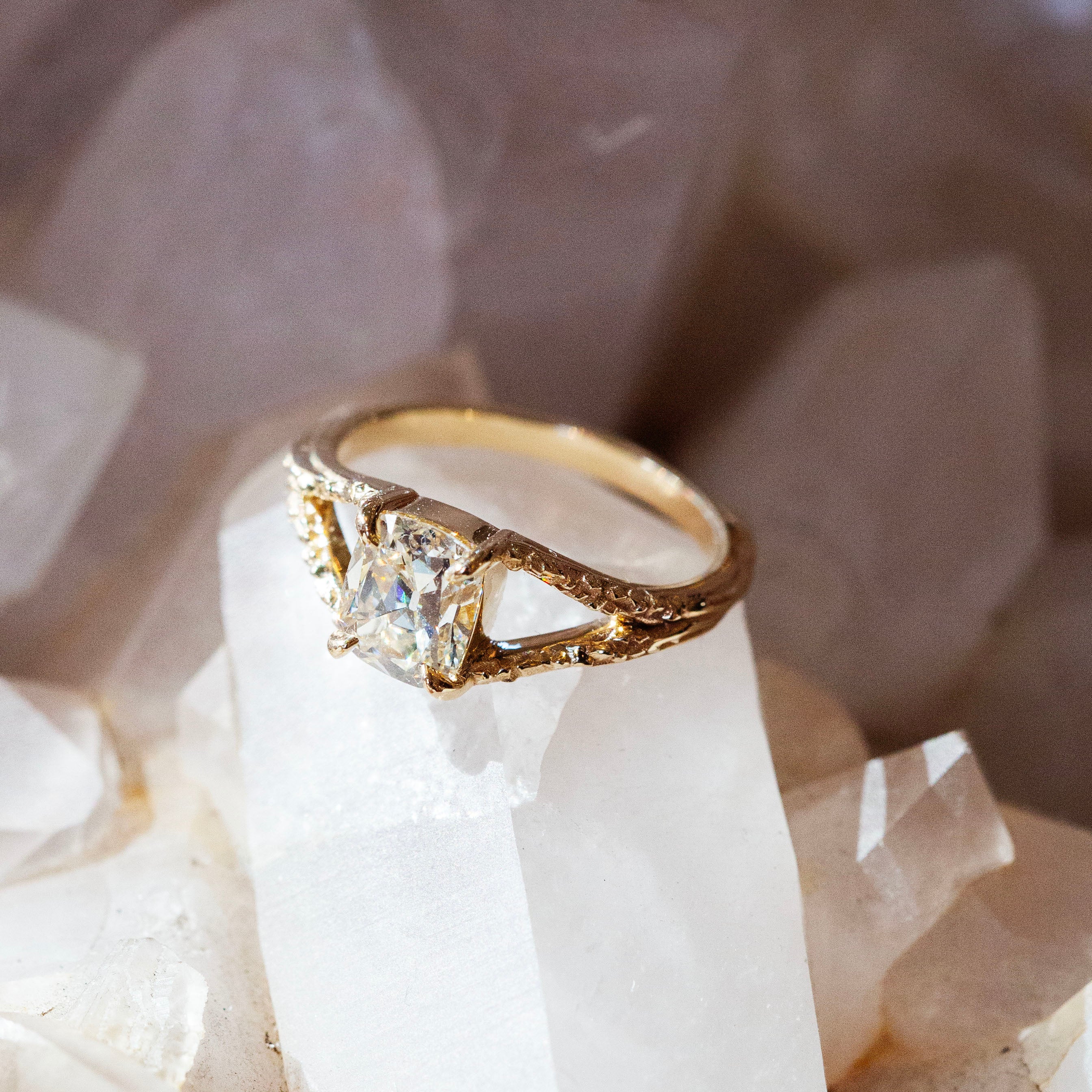 The Luminary Engagement Ring - featuring a 1.34ct Old Mine Antique Cushion Diamond. This solitaire ring features a split shank with our signature nature-inspired Matrix texture, as well as an antique, old-mine cushion-cut diamond in a prong setting.
