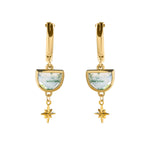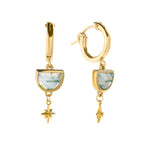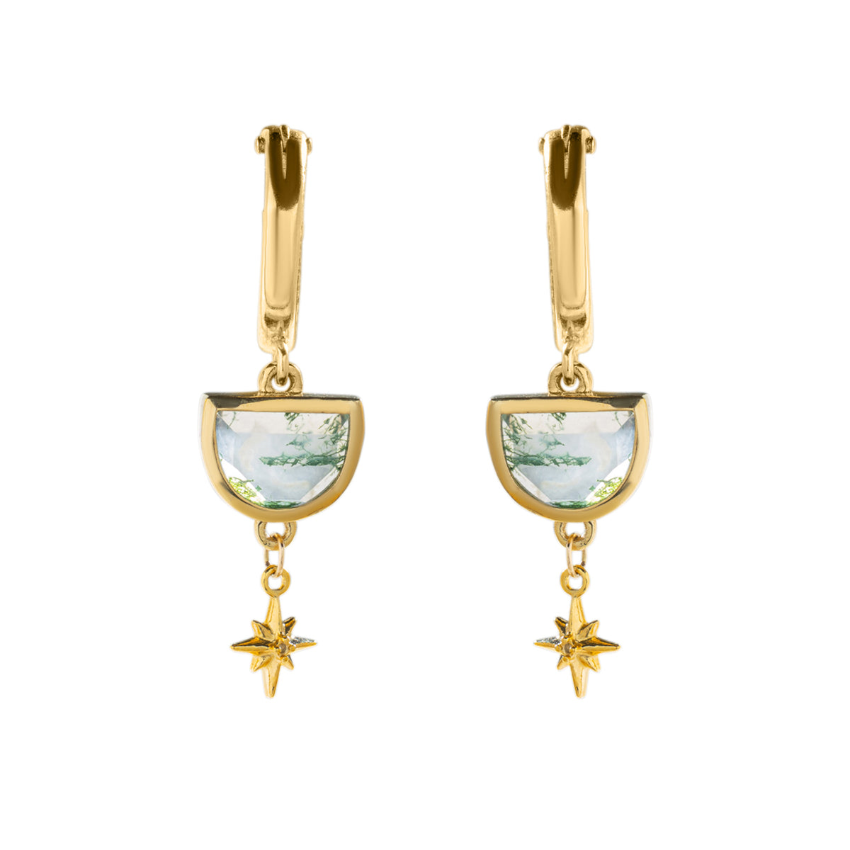 Gold-filled or sterling hoops featuring custom-cut half moon moss agate with celestial star charm dangles.