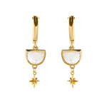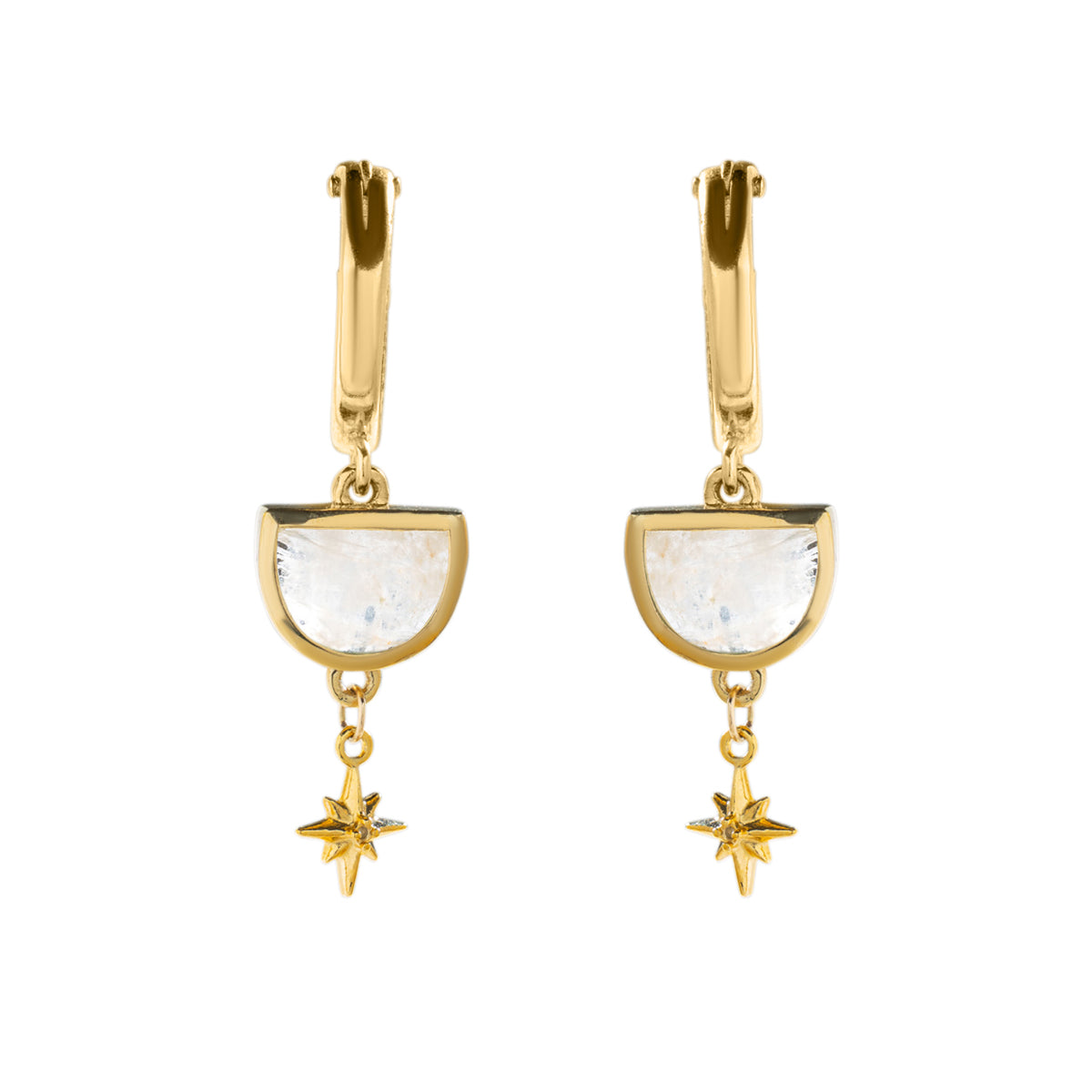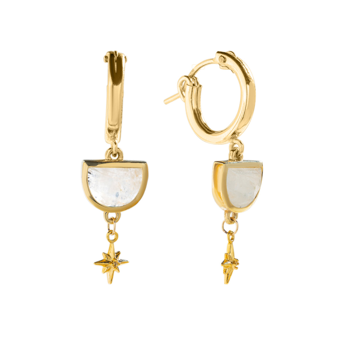 Gold-filled or sterling hoops featuring custom-cut half moon shaped moonstone with celestial star charm dangles.