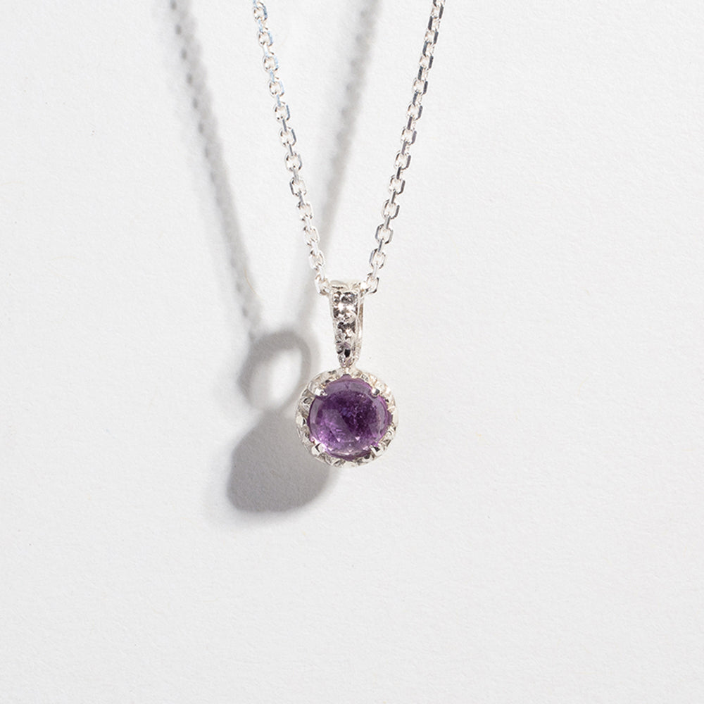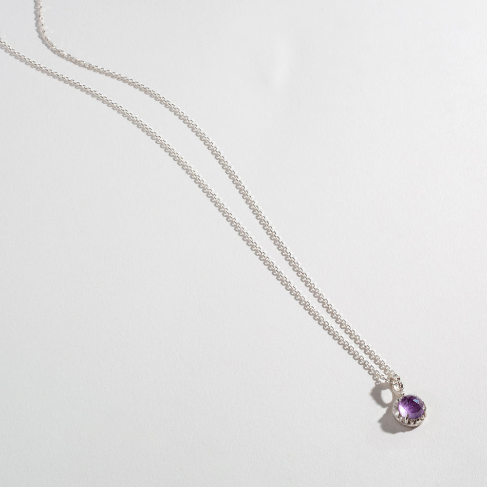 Made in sterling silver, one 6mm genuine amethyst, 18" silver chain and clasp.