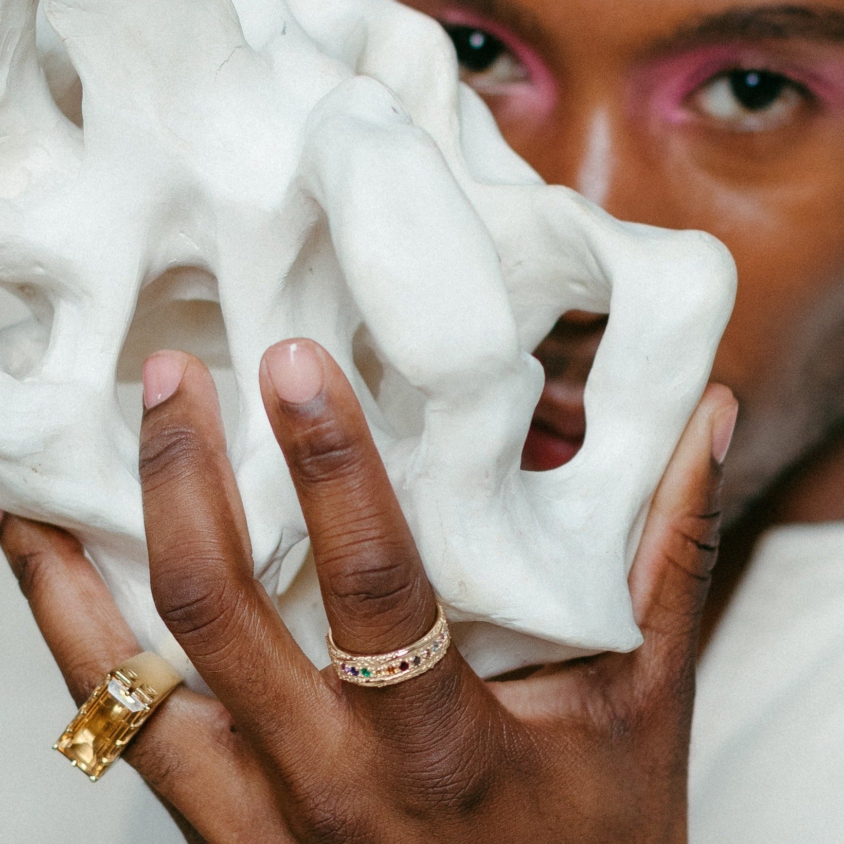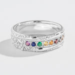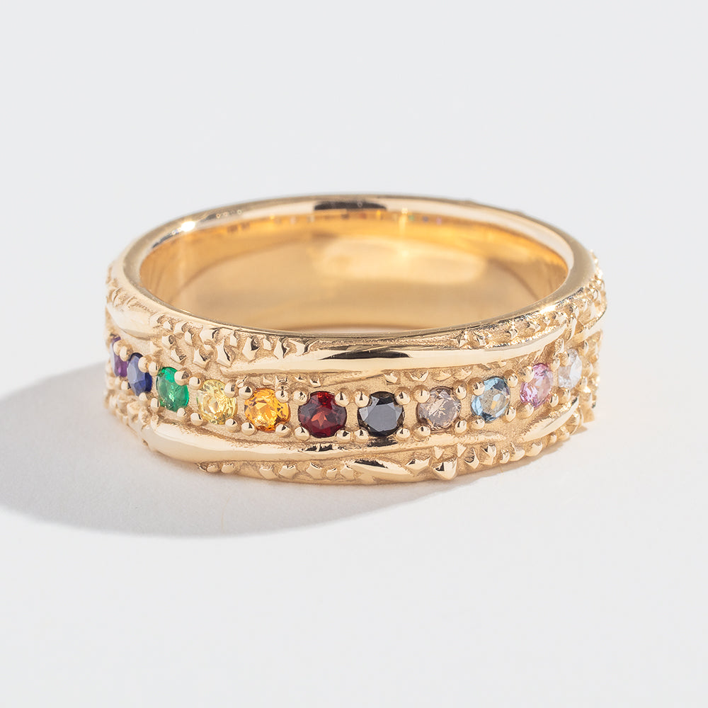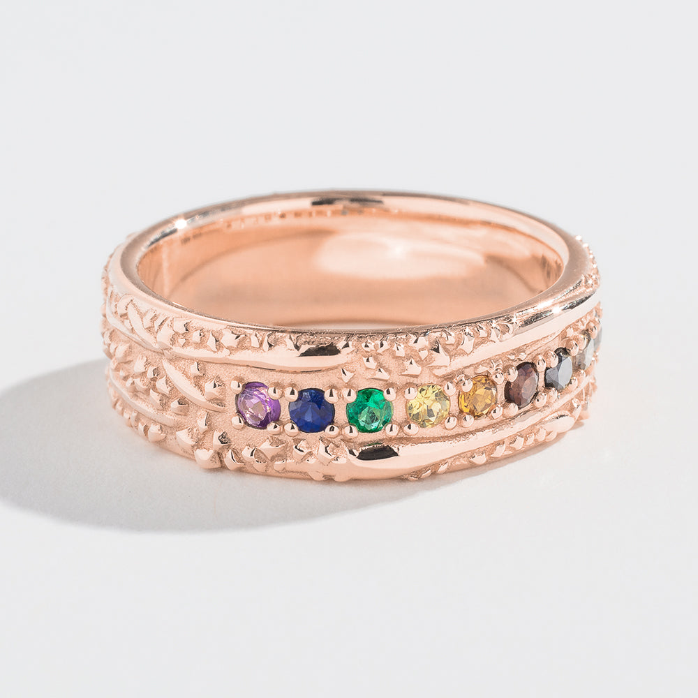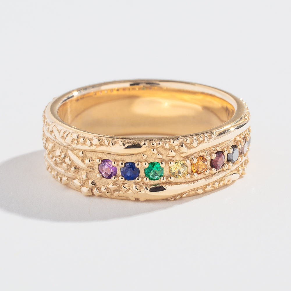 This one's for the lover of all gems. Inspired by the Philadelphia Pride Flag, Angela Monaco's Rainbow Gemstone Band is a bold yet versatile piece containing 11 assorted gemstones and a wide, textured band. Use it to propose to that special person or add it to your own collection and wear it when you want to make a statement.