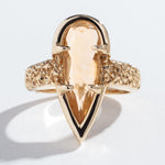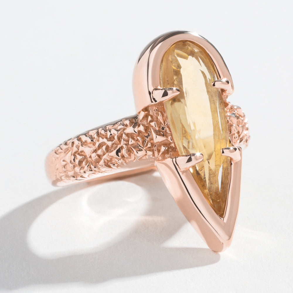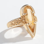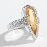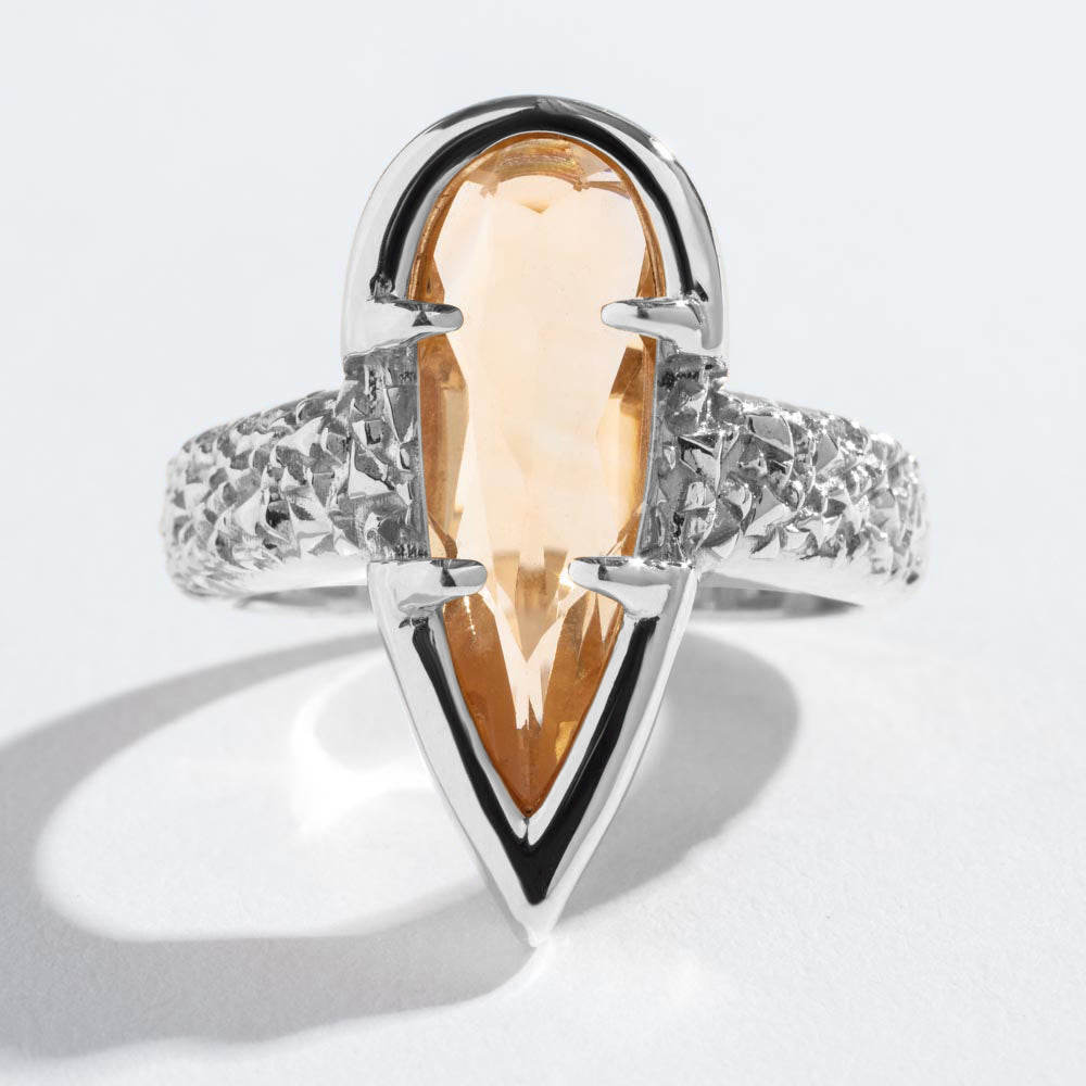 An elegant and classic ring design that’s sure to draw the eye, the Phoenix Tear Ring in citrine and silver features Angela Monaco Jewelry’s signature rocky texture and is set with a unique, elongated teardrop-shaped citrine.