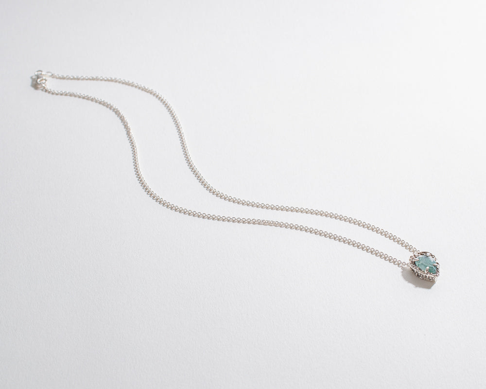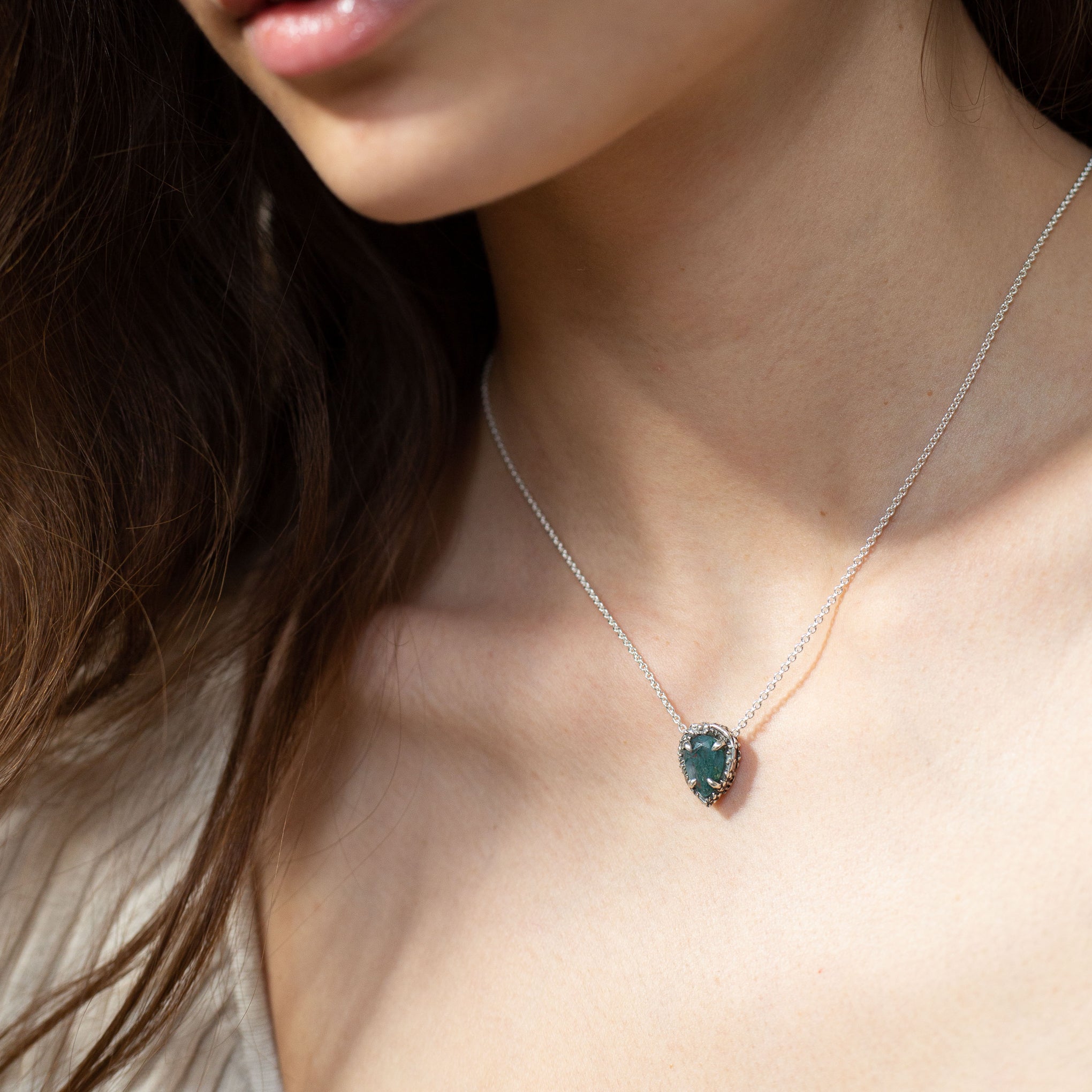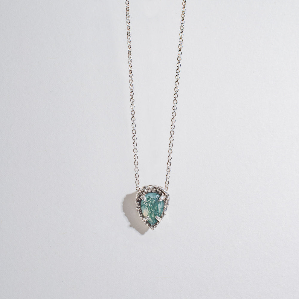 Angela Monaco's Gateway Pendant with her signature earthy texture, encapsulates a moss agate in a harmonious visual representation of stone and vegetation. Moss agate encourages tranquility and emotional balance, drawing one closer to nature.