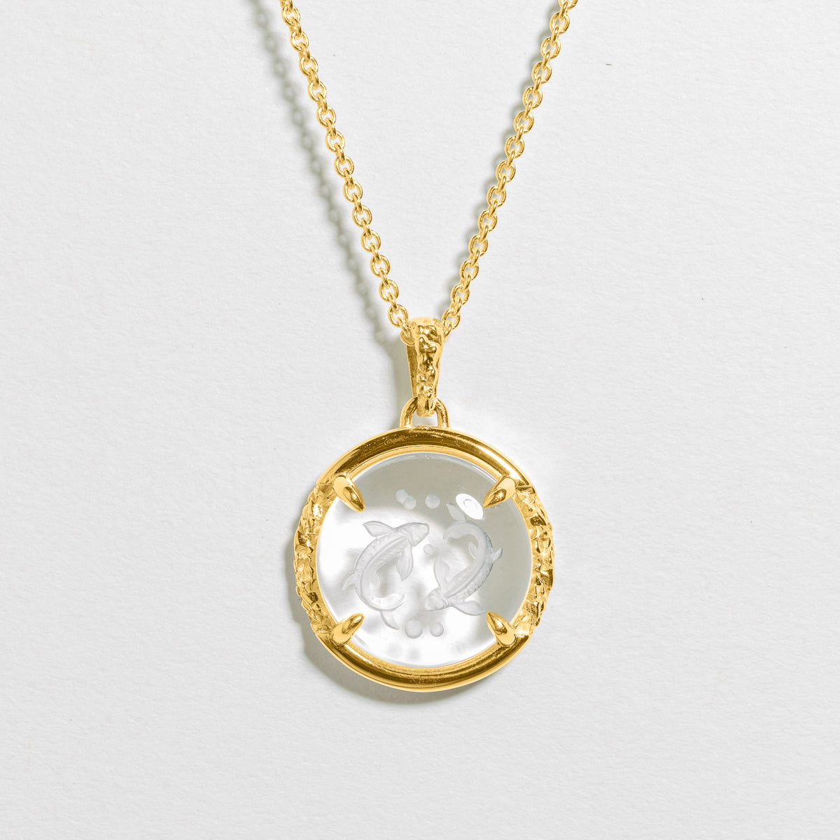 The Pisces Zodiac Intaglio Necklace features hand-carved yin–yang koi fish in genuine quartz — symbolizing intuition, emotional flow, creativity, and spiritual depth. This dreamy talisman encourages you to trust your inner knowing, embrace your sensitivity, and move with the currents of your own magic. Each Quartz carving is individually crafted using ancient intaglio techniques. Choose your Sun, Moon, or Rising Sign for a talisman aligned with your cosmic blueprint.