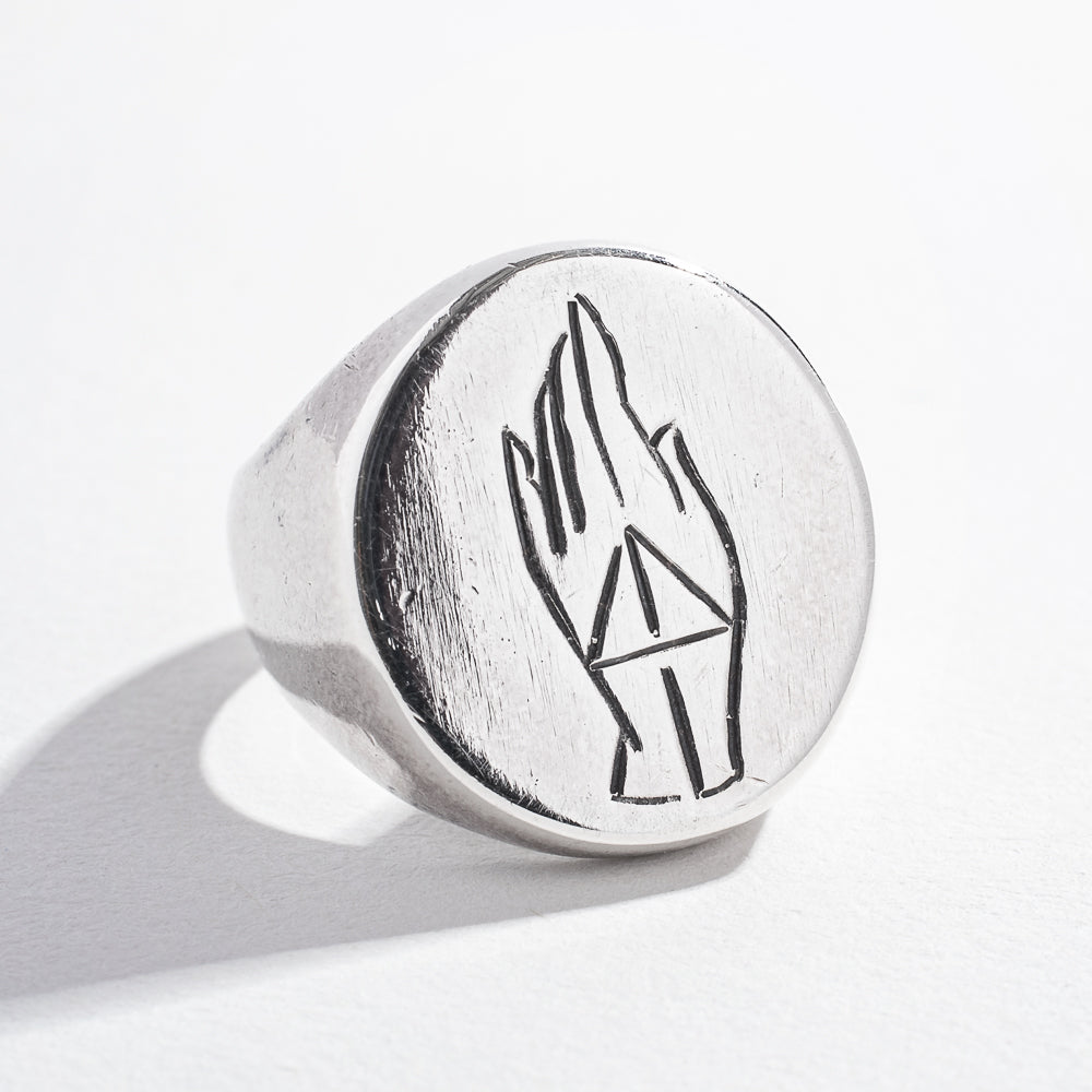 Our signature hand symbol is hand engraved on a classic signet ring. This symbol is used in many cultures and resonates with us as a talisman to provide protection, increase success, and give a feeling of harmony as you go about your day. Fit for a man or woman and comes in a wide range of sizes. Cast in solid sterling silver.