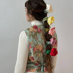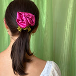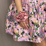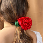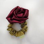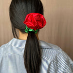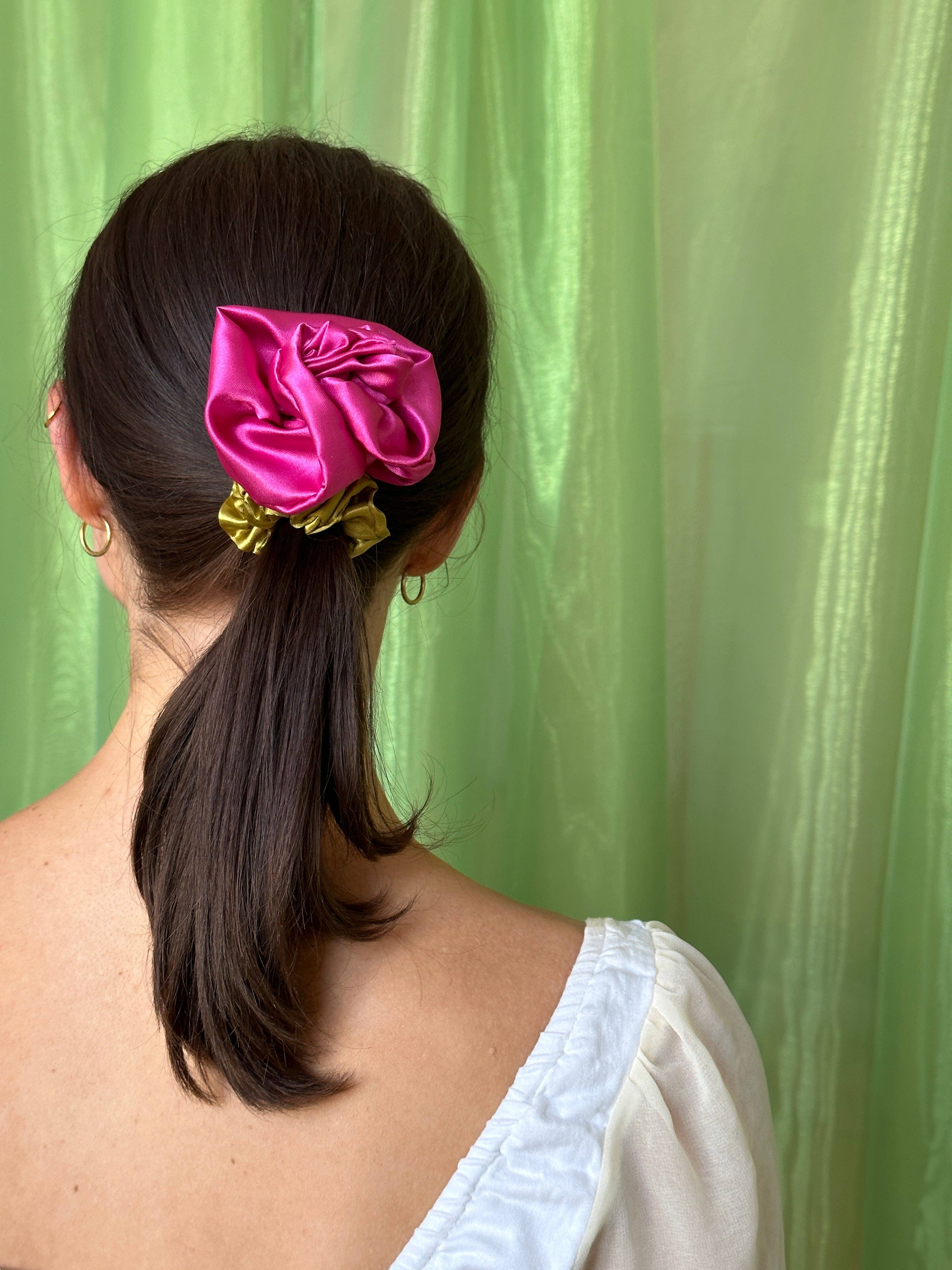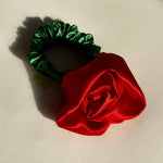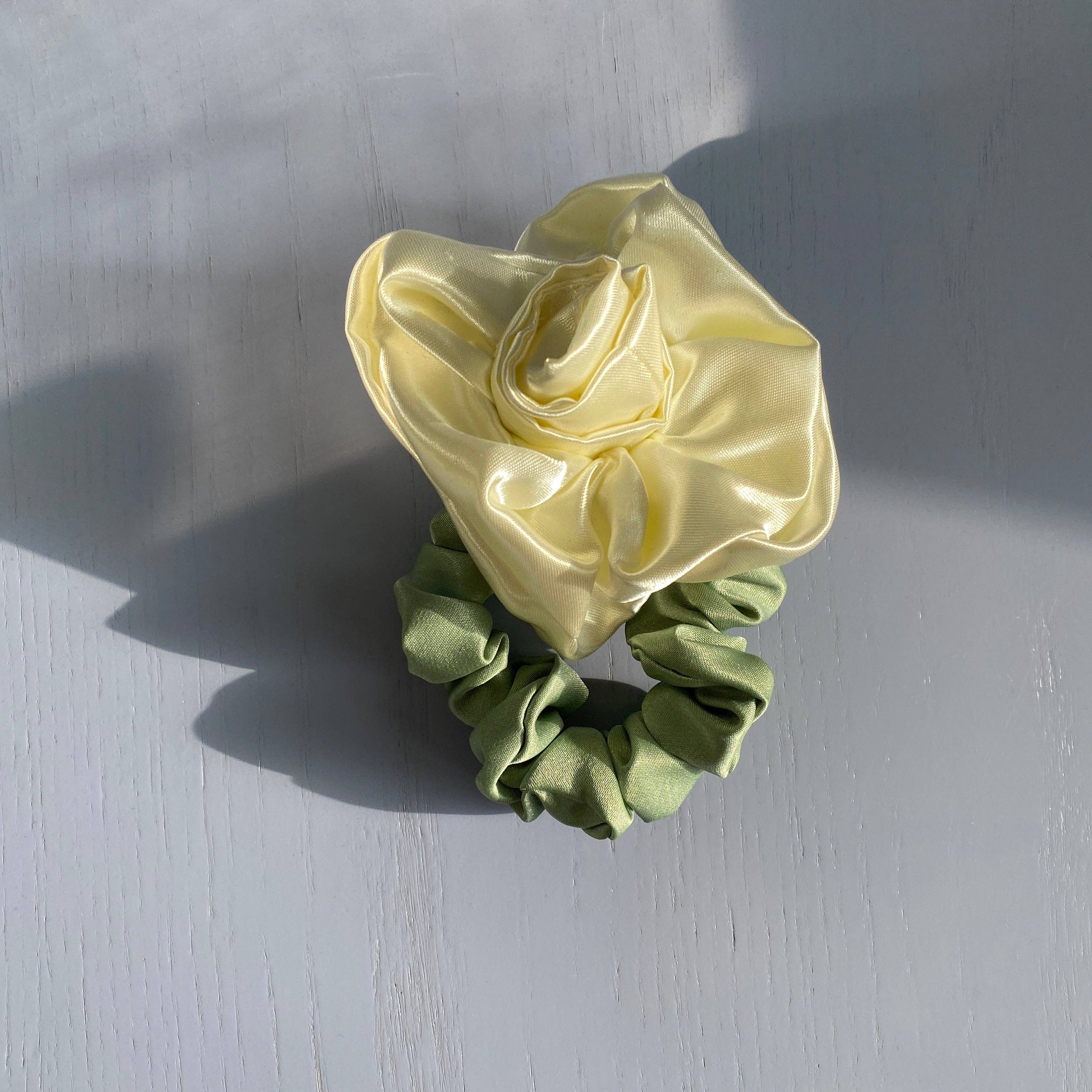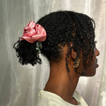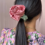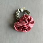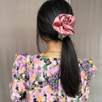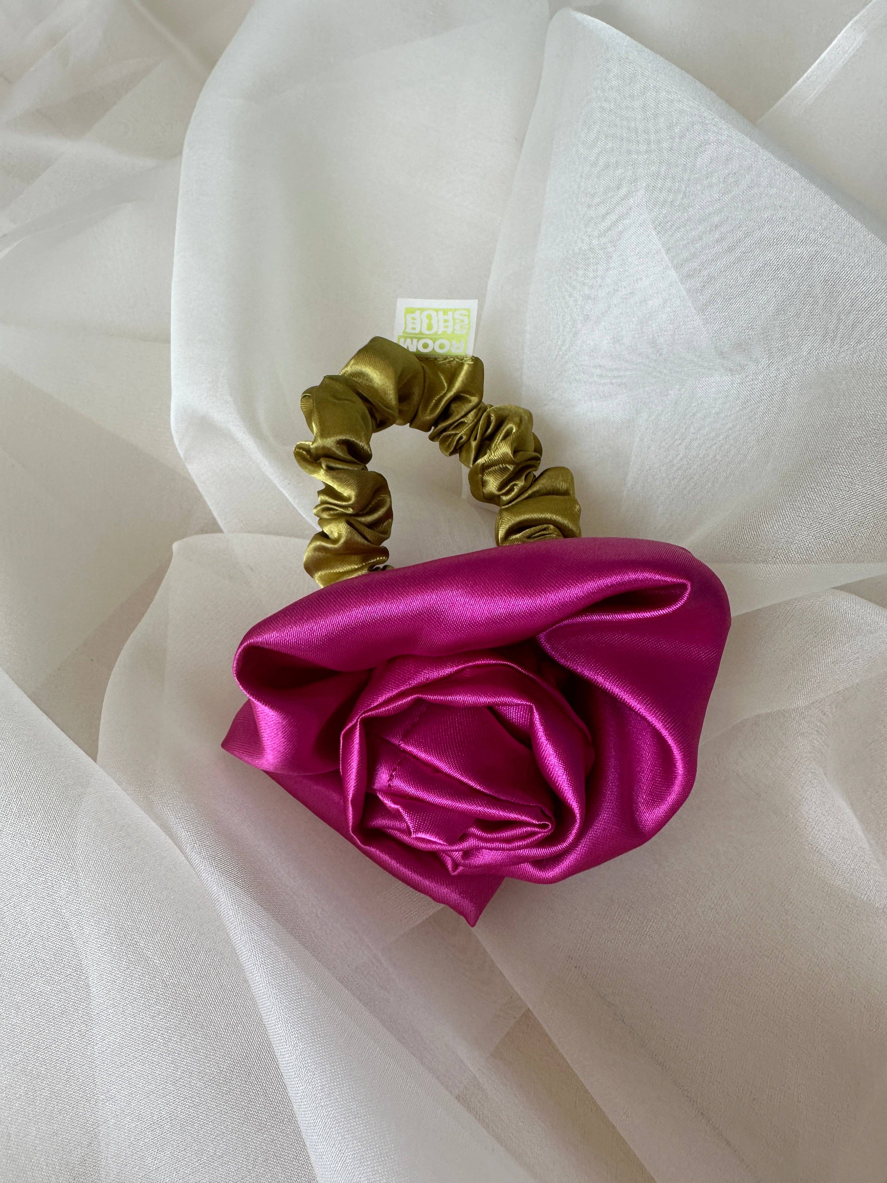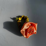 Satin Rosette scrunchie, wear on your wrist as a corsage or in your hair for the perfect floral styling note. Rosette positioned on our baby scrunchie, wrap 1, 2 or 3 times depending on hair thickness. Each rosette differs slightly. Measures 2.5”. 100% poly satin. Made in Philadelphia PA.