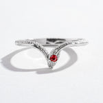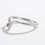 A dainty sterling silver ring measuring at 2.25mm thickness and textured throughout the outside of the band. A 1.75 mm Ruby is set on top of the snake's head.