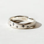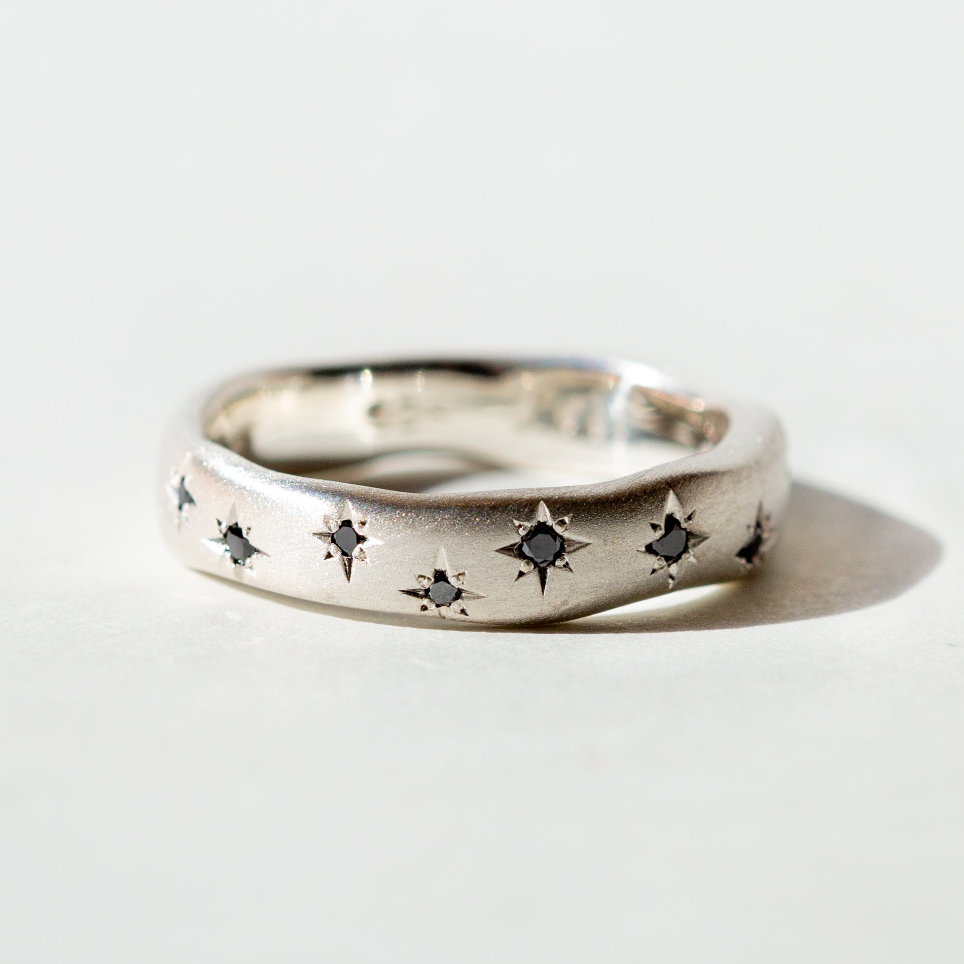 This ring was inspired by the deepest hues of the night sky with 8 black diamonds, scattered along the front length of the band, star-set in a constellation. The brushed texture and wide band make it a perfect ring for everyday wear or in a wedding set.