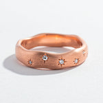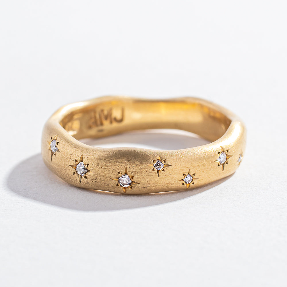 Reminiscent of the night sky, Angela Monaco's Starry Night ring has just the right amount of twinkle. This ring contains 8 pavé-set diamonds, scattered along the front length of the band. The brushed metal effect makes this ring versatile enough to wear alone, stacked, or paired as a wedding set.