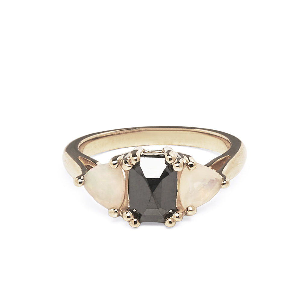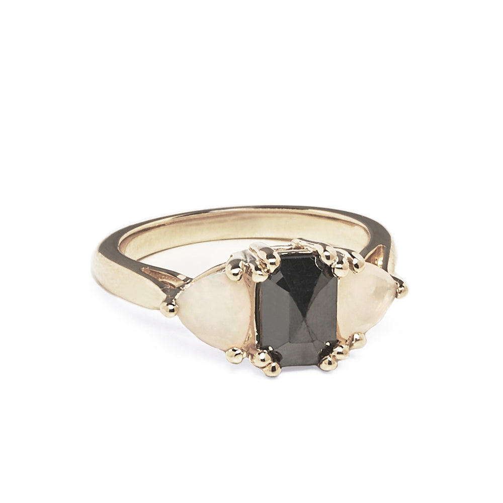 THREE STONE ENCHANTMENT ENGAGEMENT RING | 14K GOLD | BLACK DIAMOND & OPAL