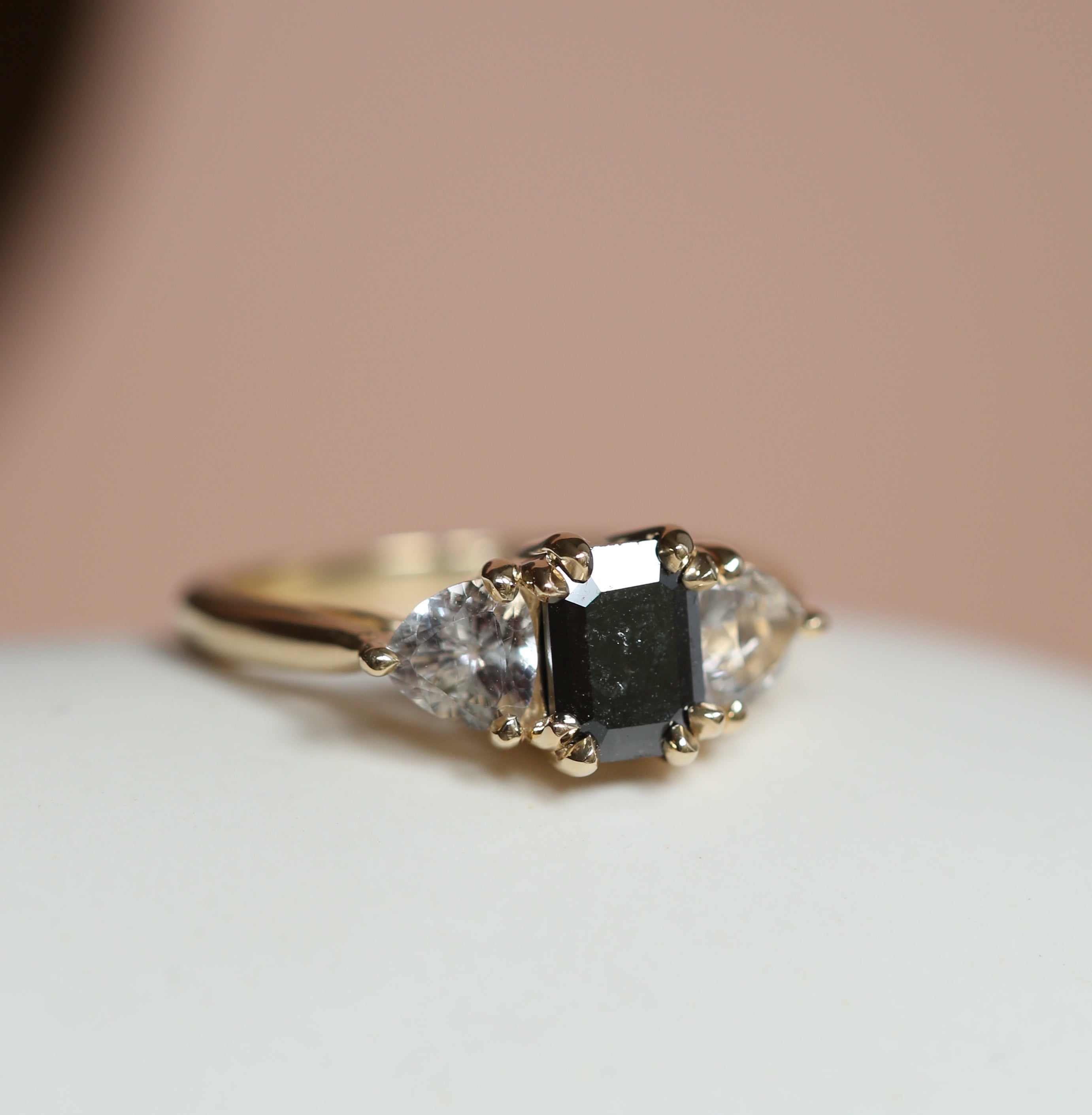 A simple, elegant, and timeless three stone engagement ring design with sultry black diamond and sustainably sourced Herkimer Diamonds