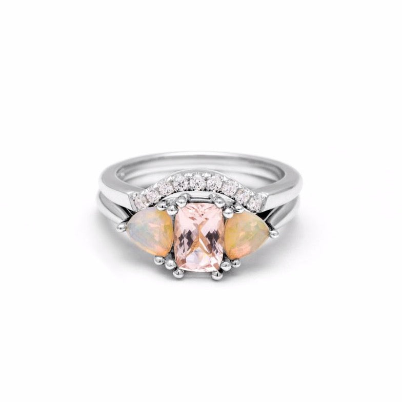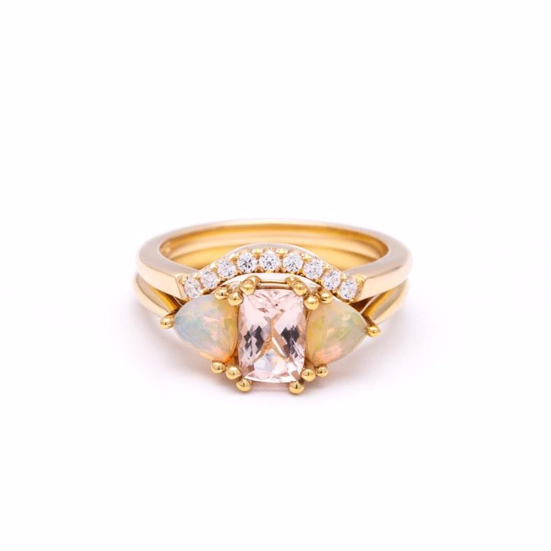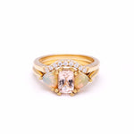 Our Three Stone Enchantment ring - A simple and elegant three stone ring design with a faceted emerald cut pink morganite flanked by two faceted trillion Ethiopian opals.  Cast in 14k yellow gold.